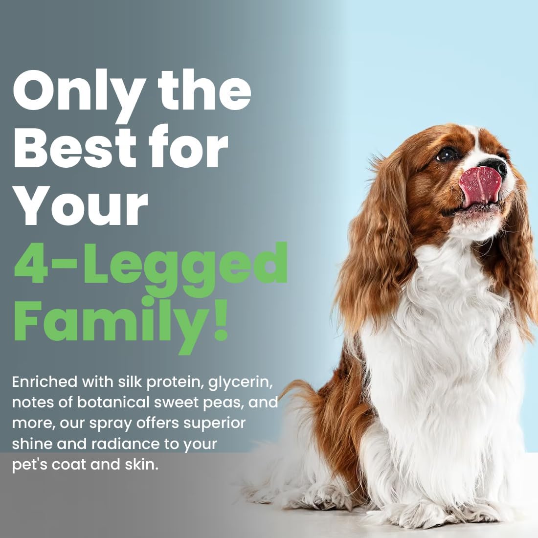 - Carefully Crafted: Enriched with essential ingredients like silk protein and glycerin along with the notes of botanical sweet peas, our pet grooming spray offers superior shine and radiance to your pet's soft coat and fur.