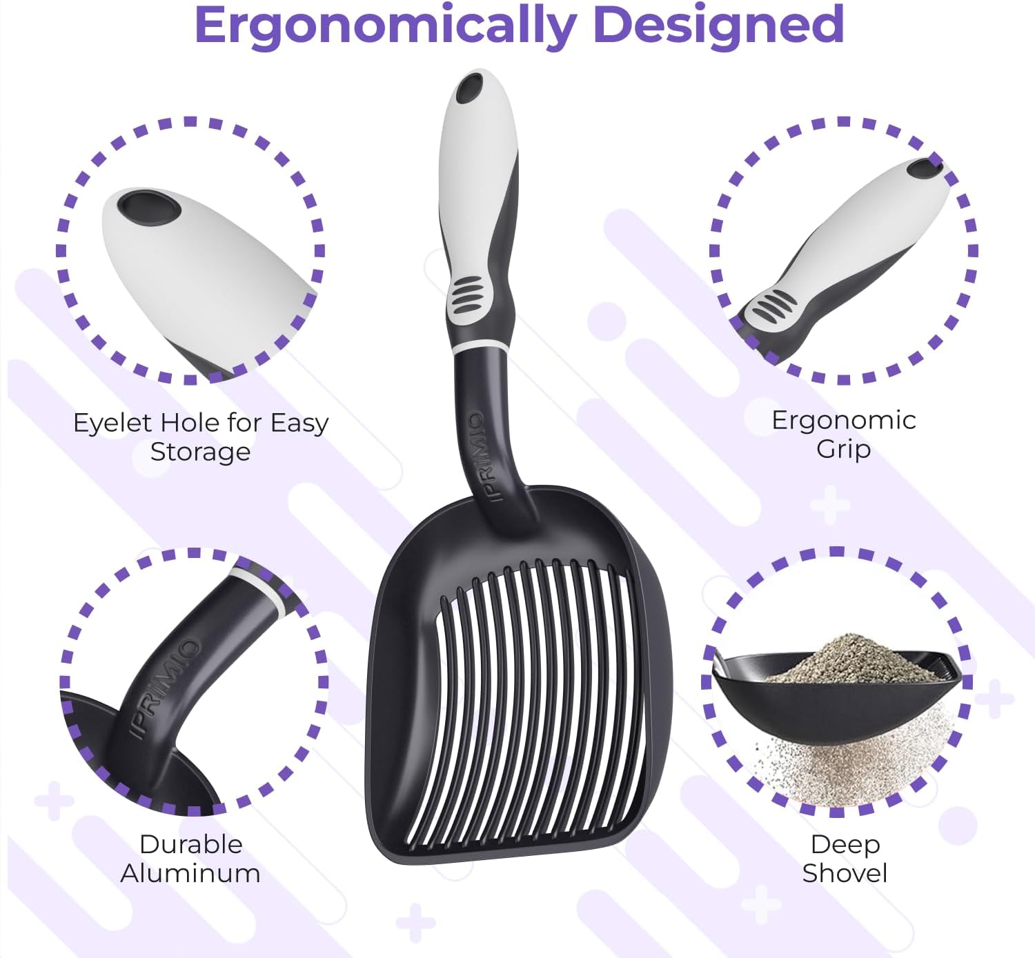iPrimio Cat Litter Scoop Metal w/ Deep Shovel, Black - Non Stick Plated Aluminum Cat Litter Scooper with Holder - Litter Box Scooper - Metal Cat Litter Scoop - Patented Sifter w/ Holder - Solid Handle