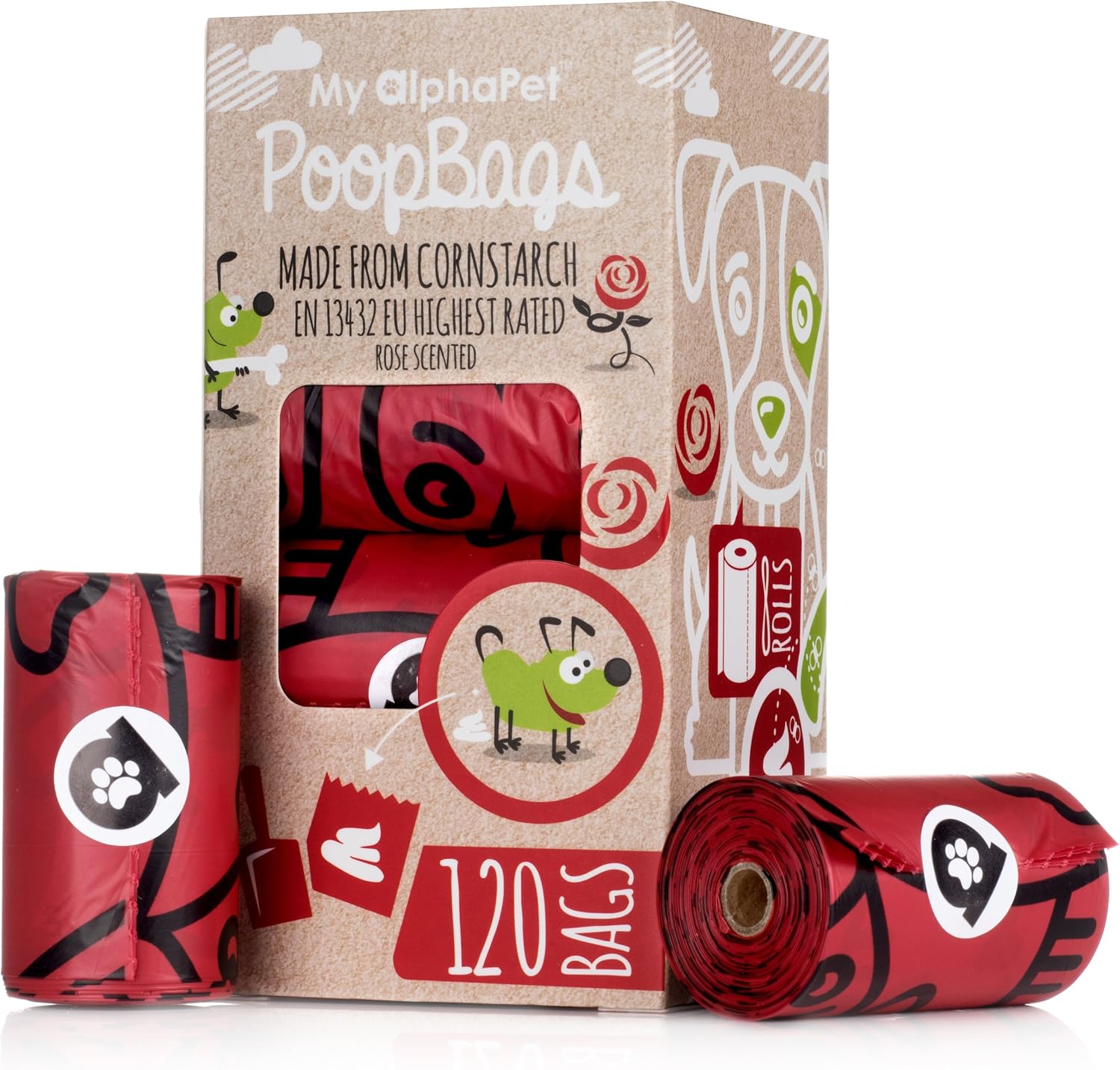 Compostable Dog Poop Bags, Cornstarch Eco-Friendly, HOME COMPOST NF T 51-800, 120 Count, Large Size Bag 9x13 Inches, 8 Unscented Refill Rolls, Leak-proof, Plantbased, GM-Free Corn (Red)