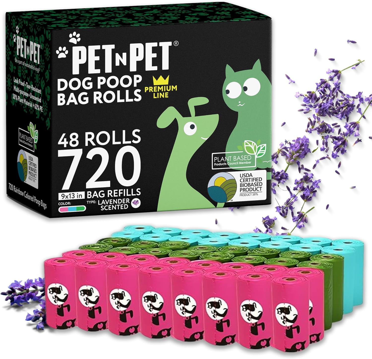 Pet N Pet 720 Counts Lavender Scented, Colorful Poop Bags for Dogs, 38% Plant Based & 62% PE Dog Poop Bags Rolls, Extra Thick Dog Waste Bag, Doggy Bag