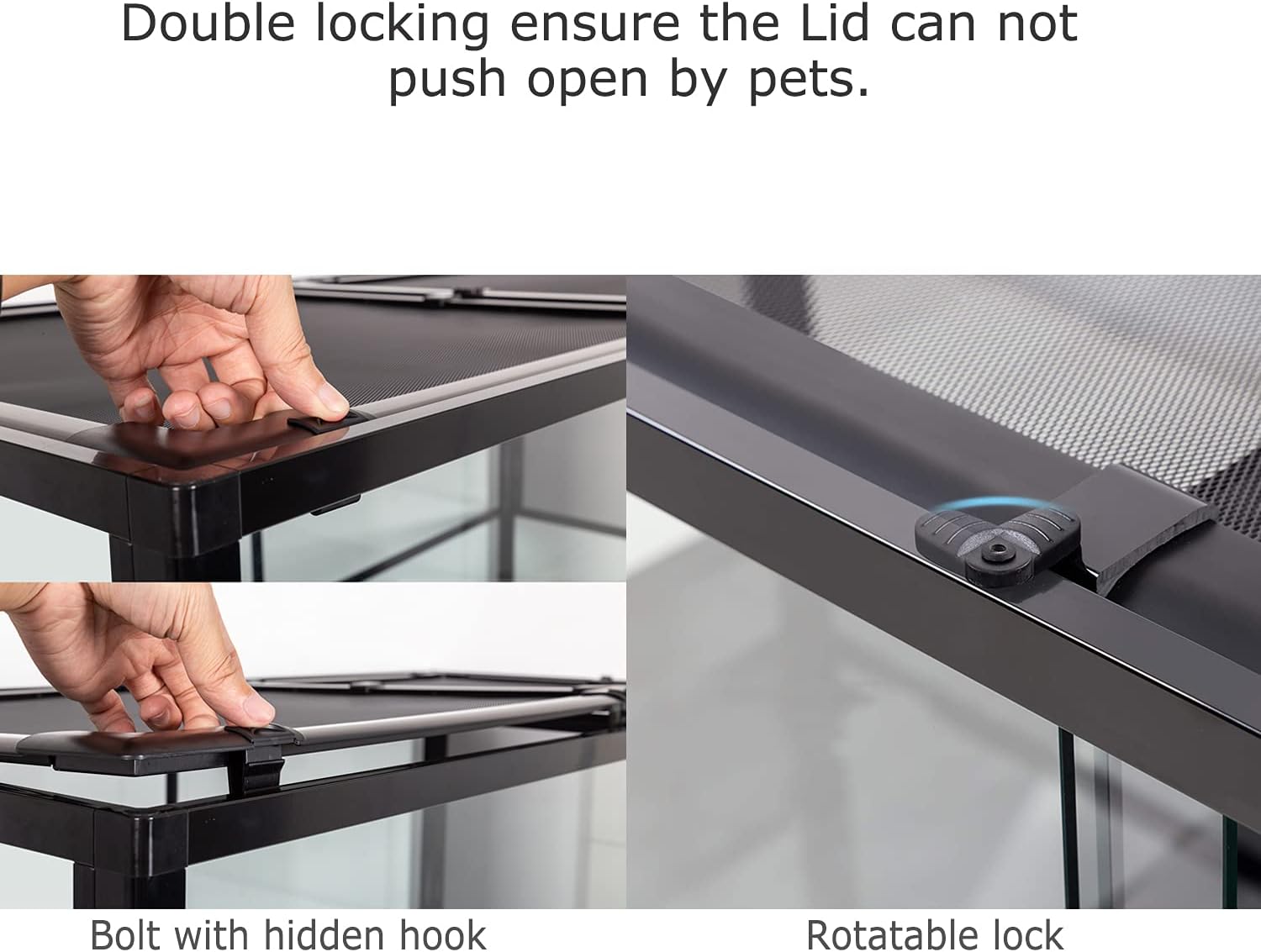- ăANTI-ESCAPEăSecurity buckle on the lid ensure the tank closed tightly, prevent your reptile amphibian chameleon pets from escaping. And the security lock avoid the doors open accidently by your kids and keep your kids safe.