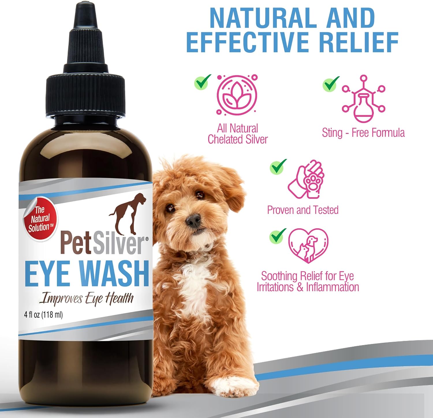 - GENTLE EYE CARE: PetSilver Eye Wash is formulated specifically for pets with eye problems. This gentle eye care solution is designed to flush and wash away particles that may irritate the eyes, promoting recovery from discomfort. The chelated silver formulation effectively removes dirt and assists with tear stains in breeds prone to eye issues, such as Persian cats and Pugs. This eye wash for dogs and cats is an easy-to-use treatment suitable for pets of all sizes and can be used for intermittent care, eliminating the need for wipes.