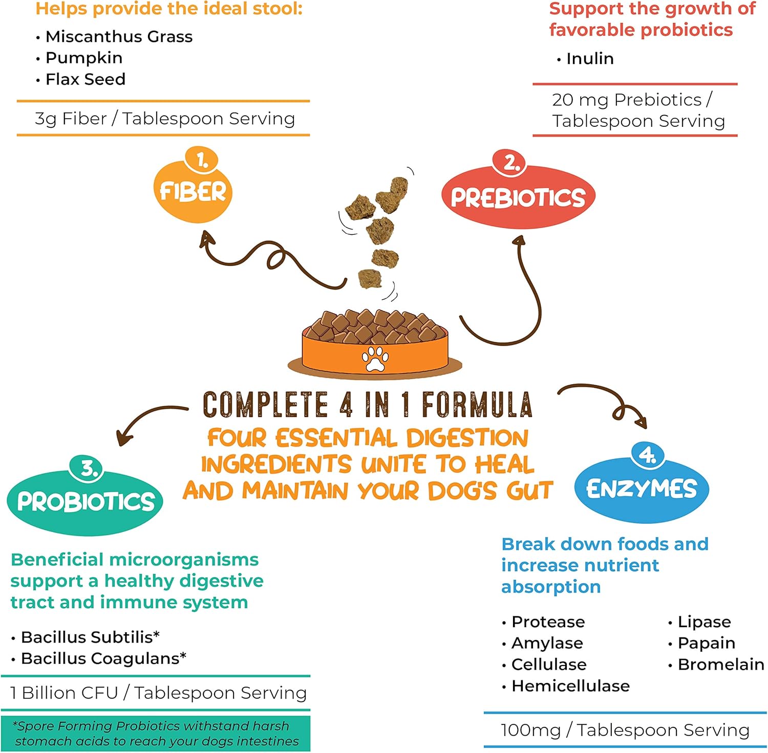 - COMPLETE 4 IN 1 FORMULA: Combines premium Fibers, Prebiotics, Probiotics and Enzymes to supercharge your pet's digestive system. These four building blocks unite to form a high fiber solution that heals and maintains your dog's gut