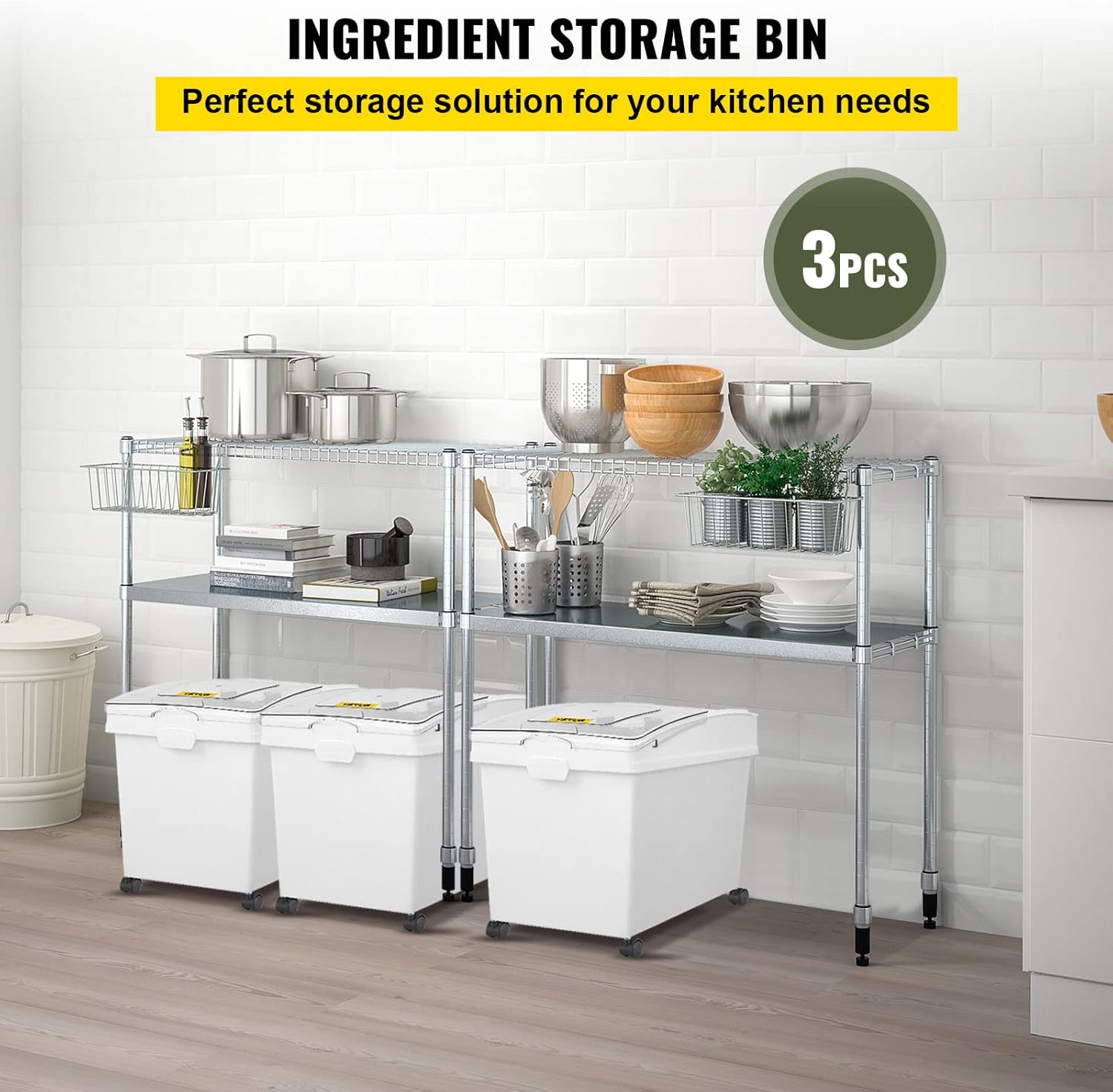 VEVOR Ingredient Bin, 10.5 Gallons Capacity Ingredient Storage Bin, PP Material Flour Bins On Wheels, White Shelf Ingredient Bin with Scoop and Sliding Lid, Commercial Storage Bins 3 Pcs/Set