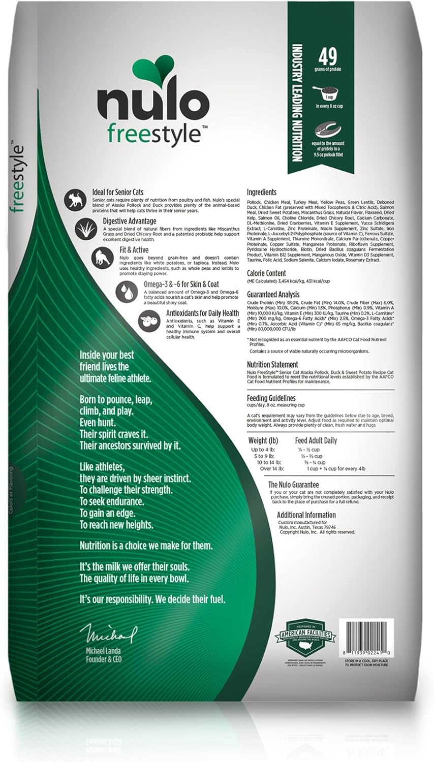 Nulo Freestyle High Protein Senior Cat Food, Alaska Pollock & Sweet Potato Recipe - Natural Grain-Free Dry Cat Food for Seniors with L-carnitine, Omega Fatty Acids, & Probiotics, 14 lb Bag