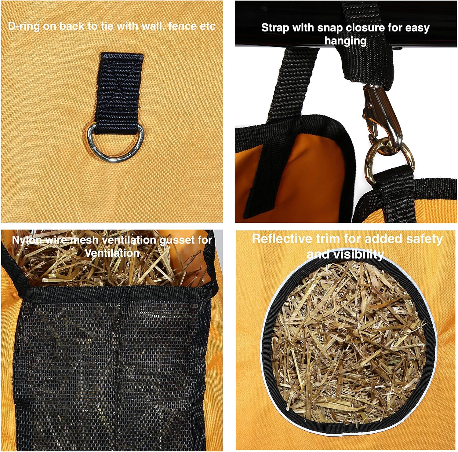 - Reinforced Resilience for Animals – We use a heavy-duty 1200 D Nylon with ultra-strong stitching for durability, reflective trim for added safety and visibility and Tough Nylon wire mess gusset for ventilation and to keep to your Hay dry.