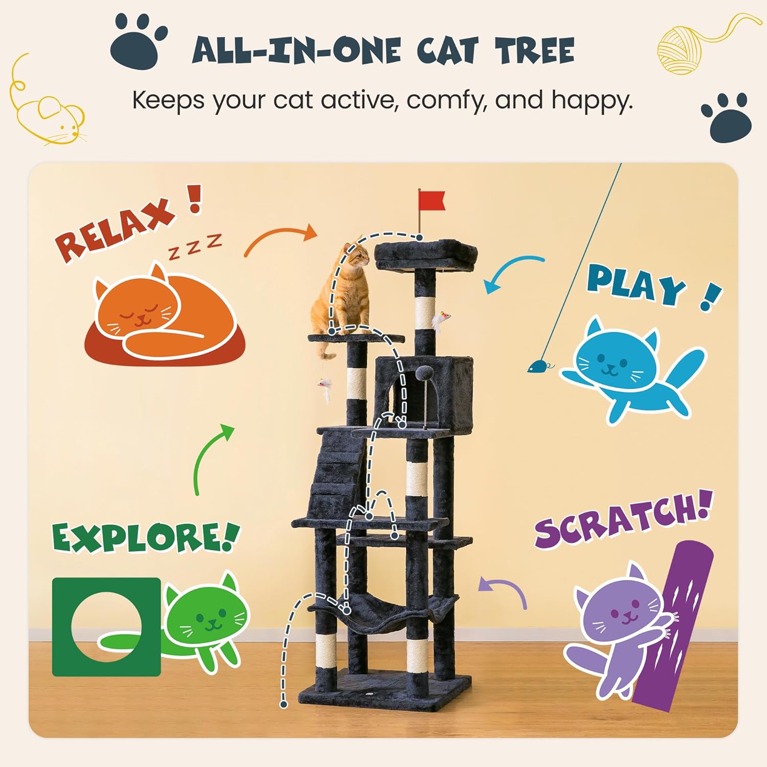 - 【PET-FRIENDLY MATERIALS】- Constructed by high-quality natural particle boards, the reinforced base plate, skin-friendly plush covering, and Natural sisal scratching posts, this cat activity tree is designed to offer a safe, sturdy and stable home and entertaining center for your little angels.