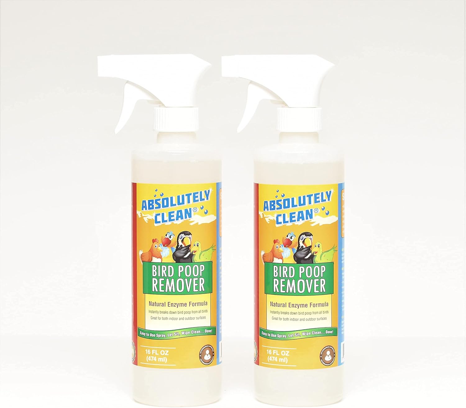 - POWERFUL NATURAL ENZYMES: Absolutely Clean Amazing Bird stain remover uses Powerful, Natural Enzymes to break down the smell and tough debris from bird droppings in your outdoor areas or bird cage. Our bird cage accessories does not give off the noxious fumes that you’ll find with other cleaners making for a more pleasant cleaning experience. Effortlessly remove bird poop off with the cleaning supplies of Absolutely Clean Amazing Bird Poop Remover.