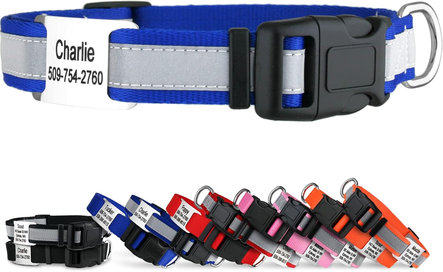 GoTags Reflective Personalized Dog Collar with Nameplate, Adjustable Dog Collar with Custom Engraved Steel Slide On Pet ID Tag, Silent, No Noise Dog Tag for Large Medium or Small (Blue, Large)