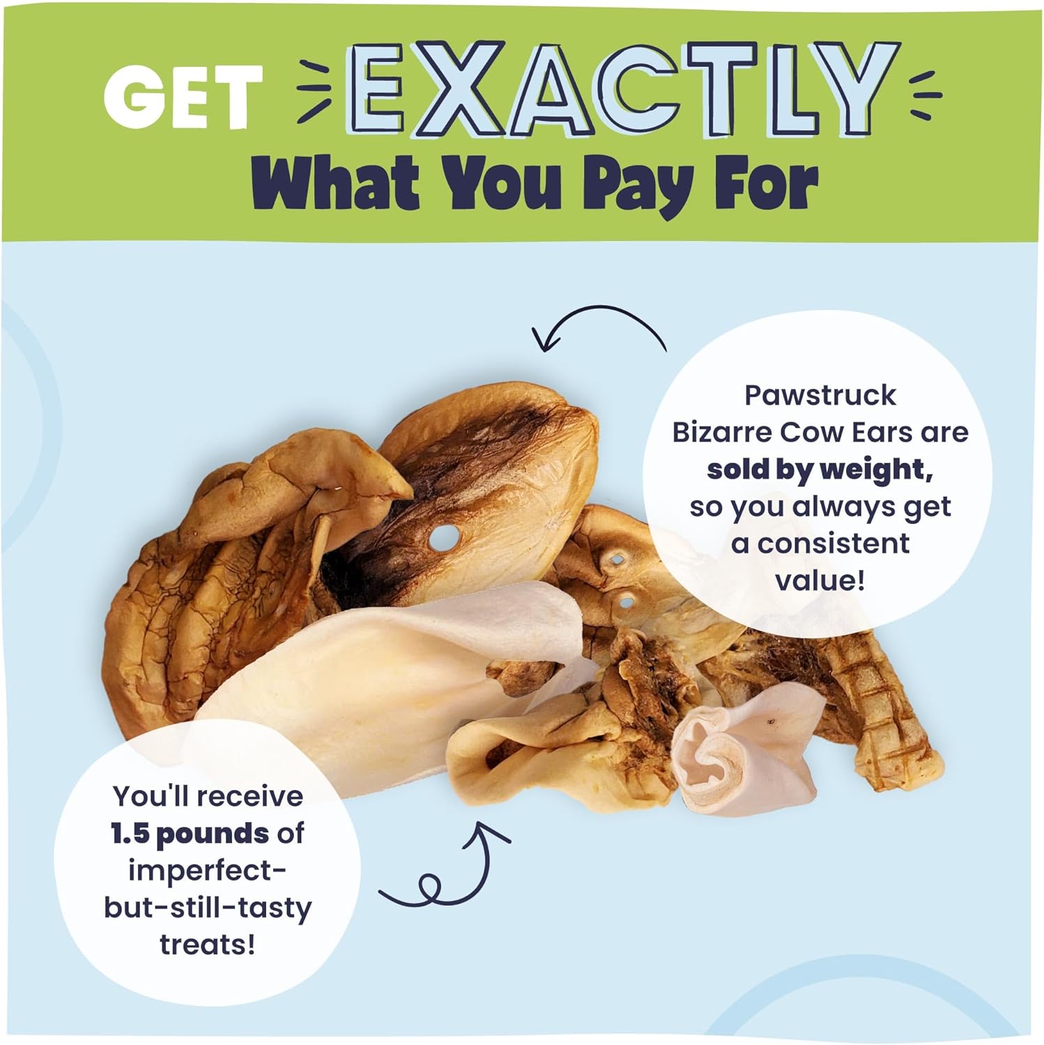 - A Fun Assortment of Cows Ears for Adventurous Pups: Our Bizarre Bargain Bag of Cow Treats for Dogs contain undersized, shriveled, blackened, or otherwise oddly shaped treats that are sure to delight a pup who loves variety. At Pawstruck, we're dedicated to bringing your pup great-tasting chews while eliminating food waste, reducing our carbon footprint, and helping you save money -- all while giving your fur kid great-tasting treats made from top quality ingredients.