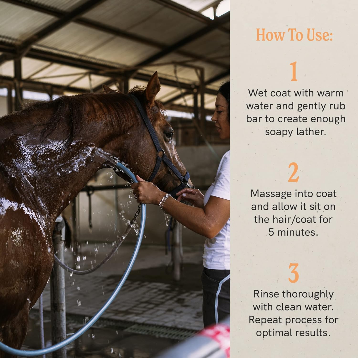 - HEALTHY SHINY COAT: Add our shampoo with natural oils to a bucket of water to lather, cover and wash your horse. Removes dust, dirt and mud and quickly hoses off leaving no residue. Restores moisture and strengthens the hair of the coat, main and tail.