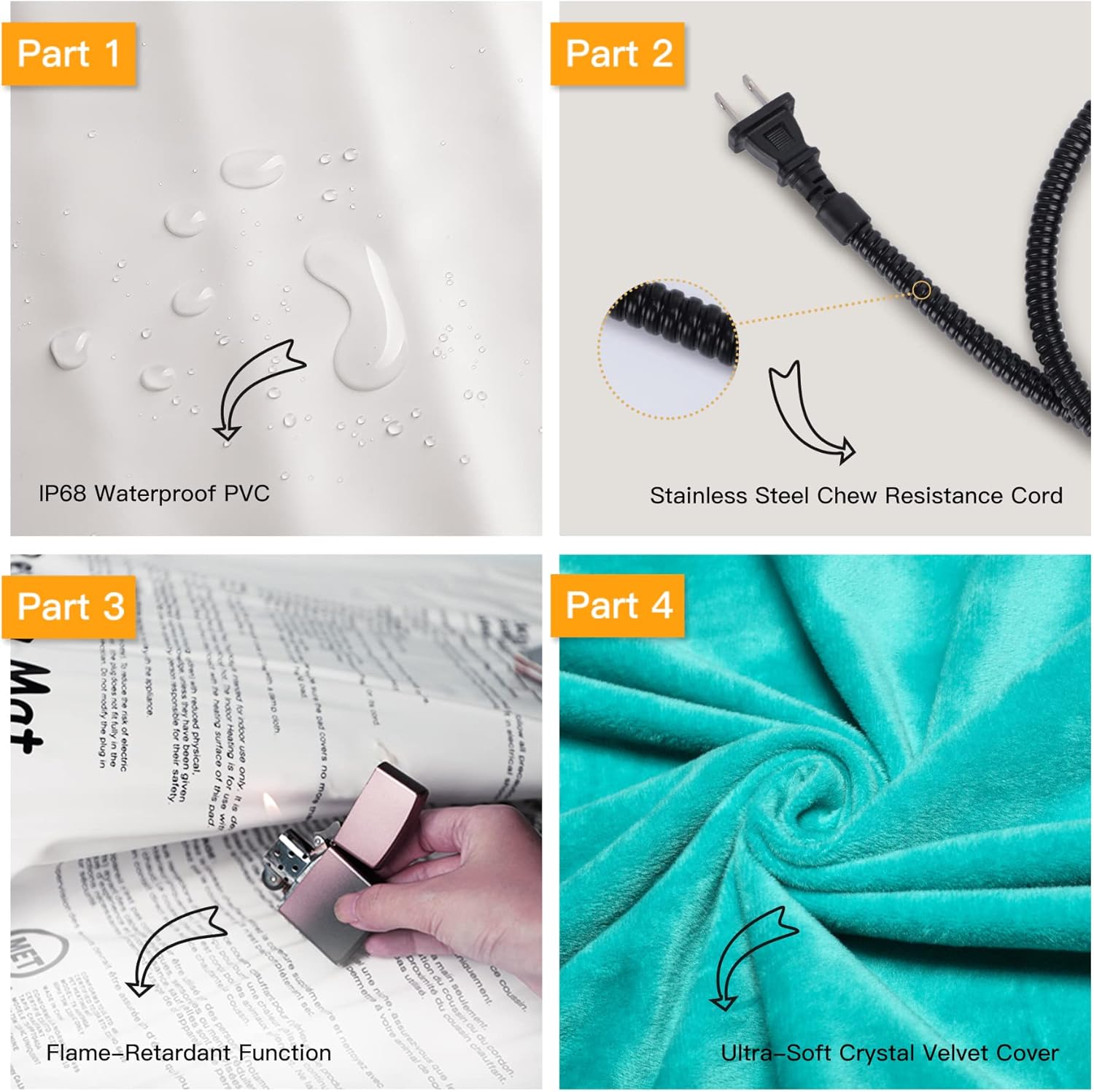 - ❤【Safety and Secure Structure】7-layer protective structure with UL-certified heating wire protect pets from burns. Soft PVC envelope with waterproof and flame-retardant function. Built-in intelligent temperature sensor in the heating pad to prevent overheating to protect pets. Don’t let your pets lay on the pet heating pad without a plush cover.