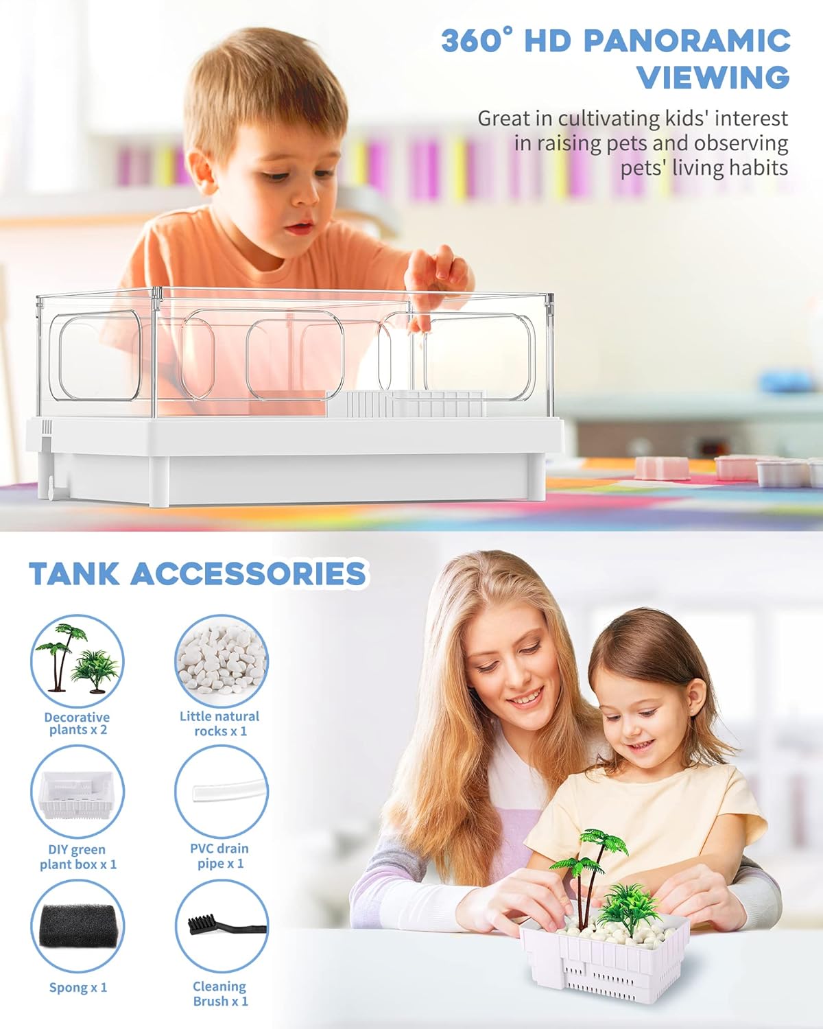 - ăFULL ACCESSORIES & EASY TO INSTALLăOur package includes all accessories you need to set up a basic tank. 4PCS acrylic panels, 1PC tank bottom, 1PC PVC pipe, 1PC sponge, 2PCS decorative plants, 1PC cleaning brush, 1BAG rocks(240g), 1PC manual. The installation is an easy job with our manual inside the pack!