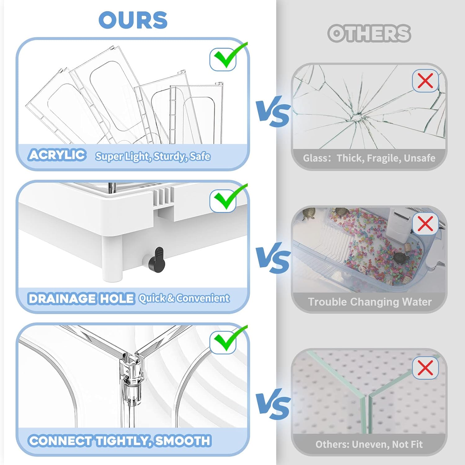 - ăTRANSPARENT DESIGN FOR BETTER VIEWINGăTurtle habitat is built with acrylic panels. Acrylic panels are completely transparent. You can enjoy the inside view clearly and watch your pets easily. The panel has a thickness of only 5mm which is much lighter, safer and more durable if compared with those made of glass.