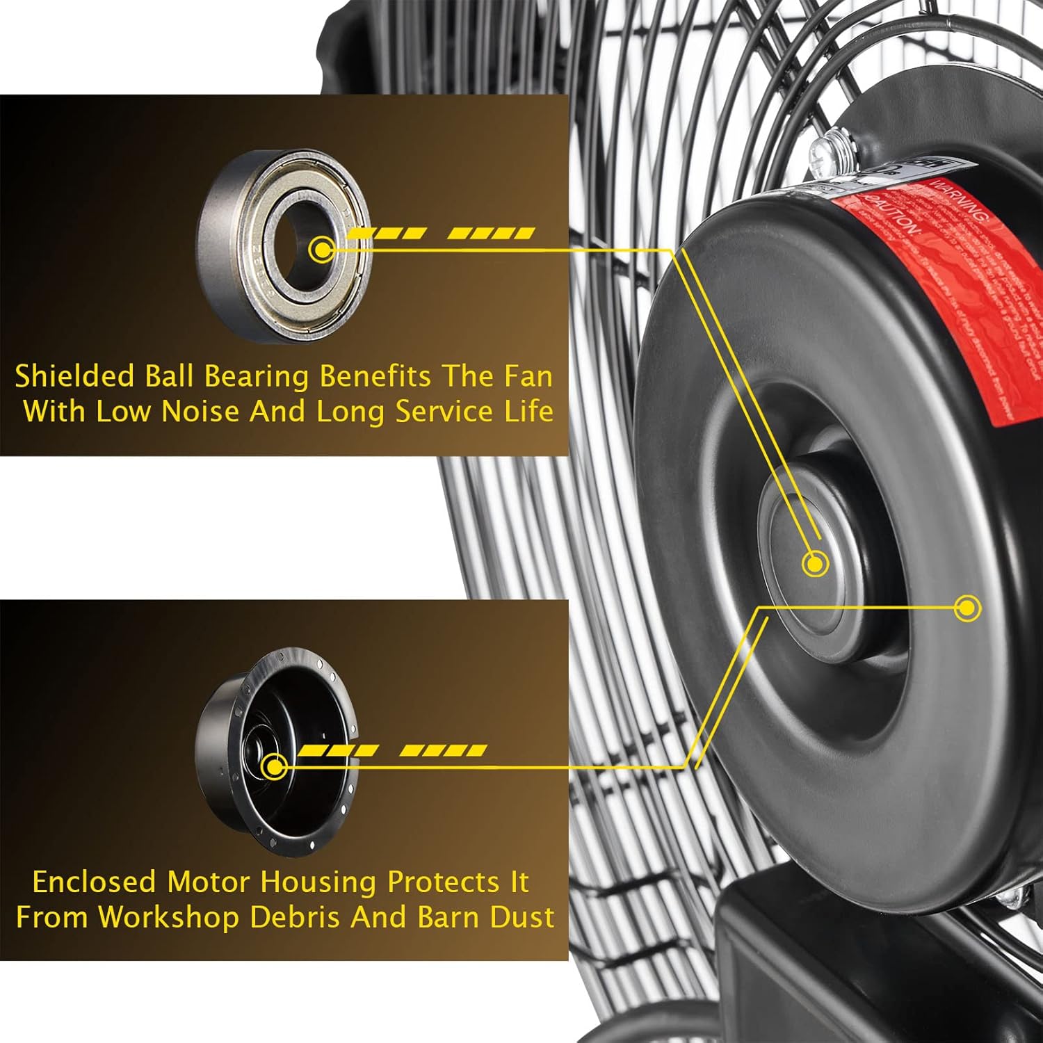 - 【Moves Much Air】: Built with 1/6HP Premium TEAO Enclosed Motor and Shielded Ball Bearings, this heavy duty industrial wall fan provides refreshing breeze for circulating large spaces, blowing distance reach 30 feet. It is ideal for Warehouse, Workshop, Factory, Garage, Basement, Greenhouse, Barn, Industrial, Commercial and Residential areas. Perfect festival gifts for Christmas/Thanksgiving Day/New Years. High speed 4600 CFM / Medium speed 4100 CFM / Low speed 3800 CFM
