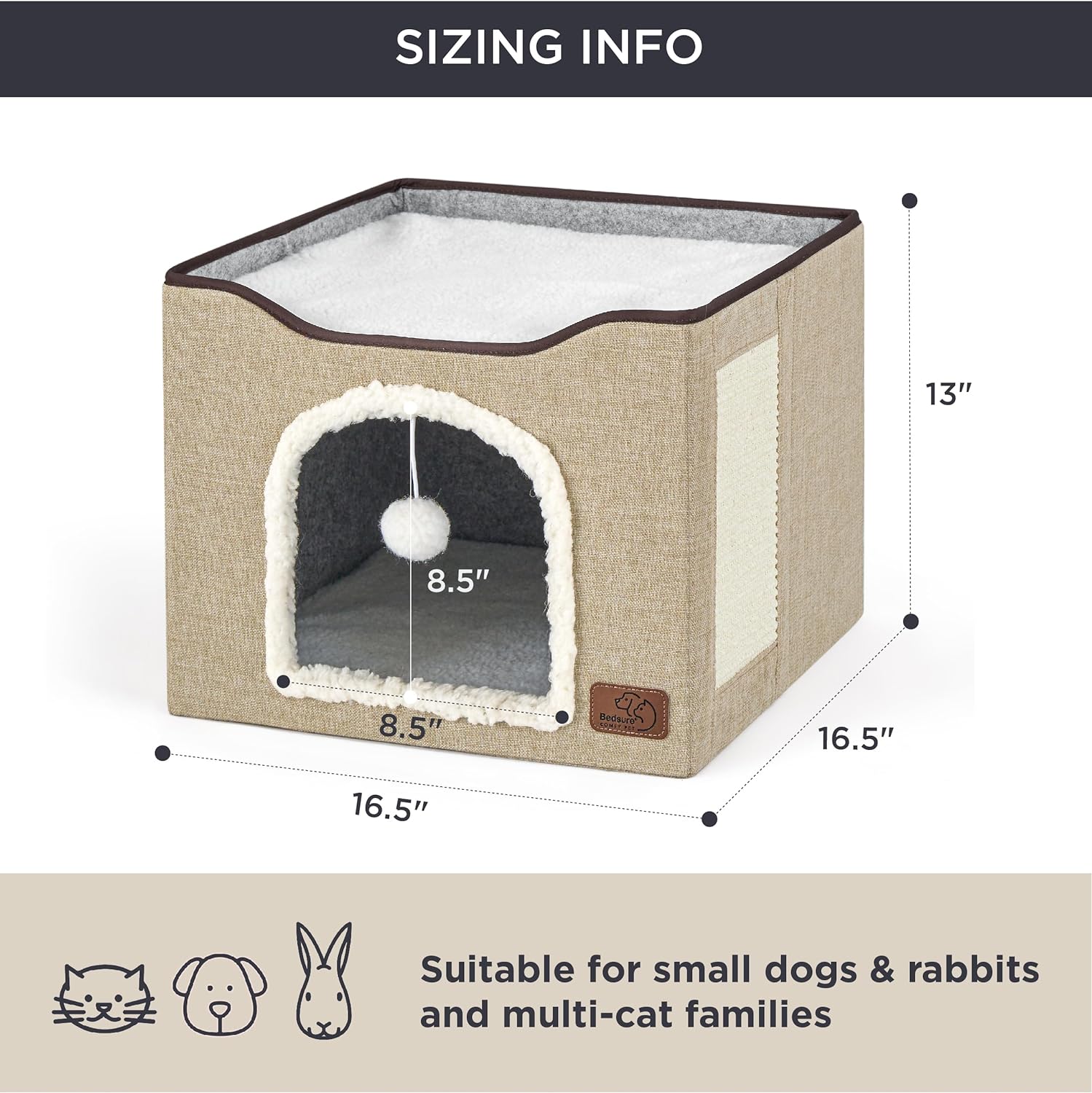- Pet Safe Design: Cat hideaway made from pet-friendly MDF materials with CARB Certification and soft lambswool fabric. This large cat house is equipped with a durable sisal scratching board and plush hanging ball to keep your cat engaged and happy.