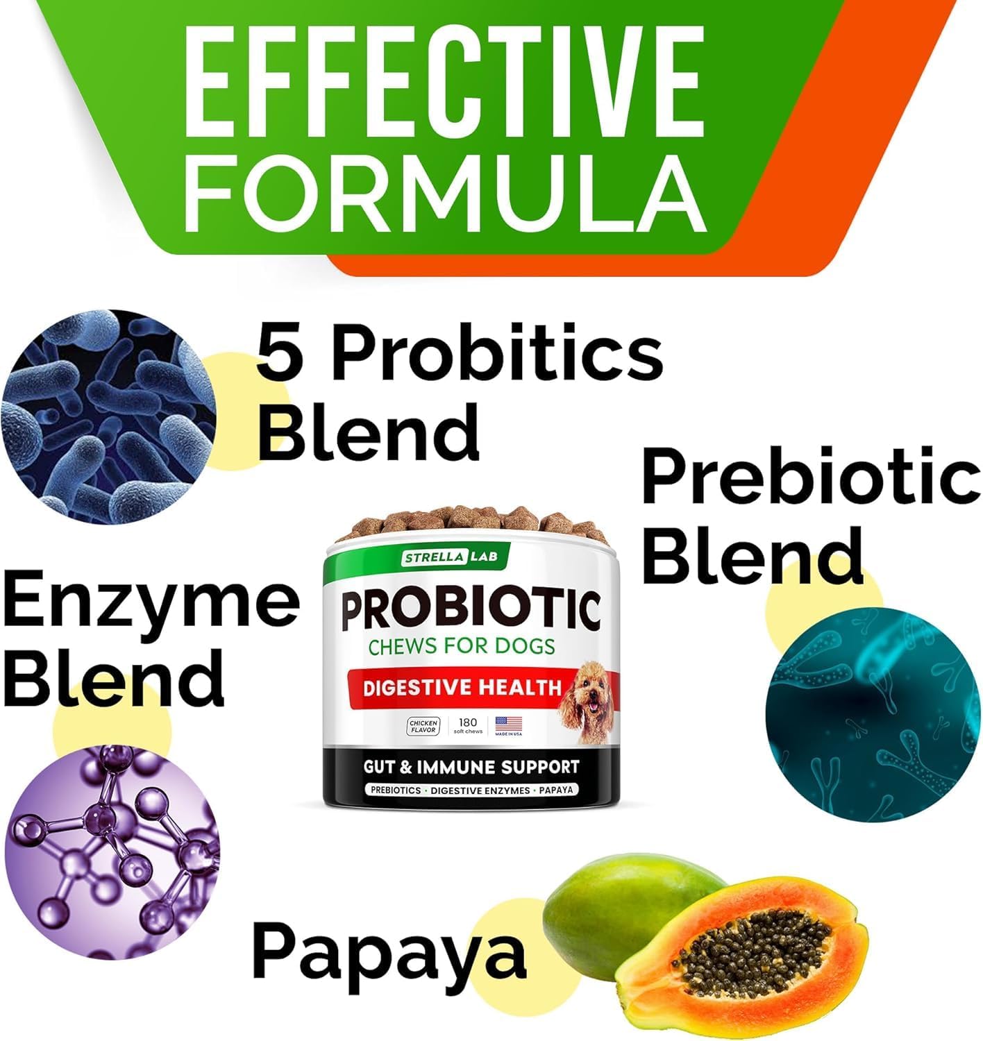 StrellaLab Dog Probiotics Treats for Picky Eaters (180ct) - Digestive Enzymes + Prebiotics - Chewable Fiber Supplement - Allergy, Diarrhea, Gas, Constipation, Upset Stomach Relief - Improve Digestion