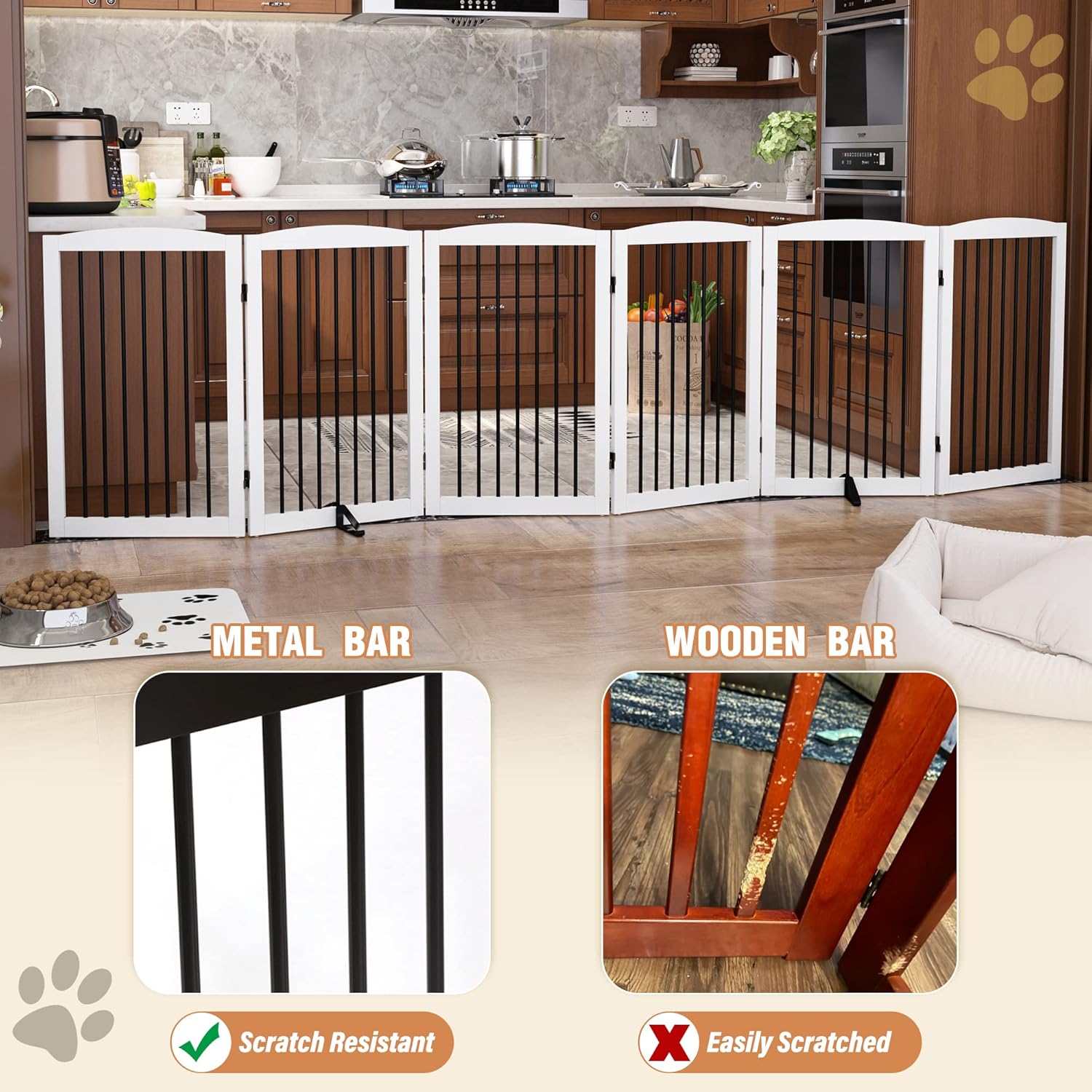 Freestanding Pet Gate for Dogs, Indoor Wooden Foldable Dog Gate for House, Extra Wide, Pet Fence for Stairs, Doorways, Halls, Support Feet Included, 120 Inch Wide, 6 Panels 32",White