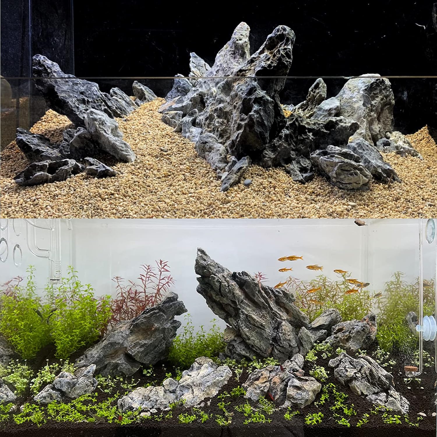 - Gift-Worthy— These fish tank rocks can be paired with KINGRUI's Natural Slate Rocks, Seiryu Stones, Dragon Stones,River Rock,Pagoda Rocks and Turtle Platforms to create stunning aquascapes or outdoor rockery landscapes. They enhance any environment and make a thoughtful gift for pet lovers