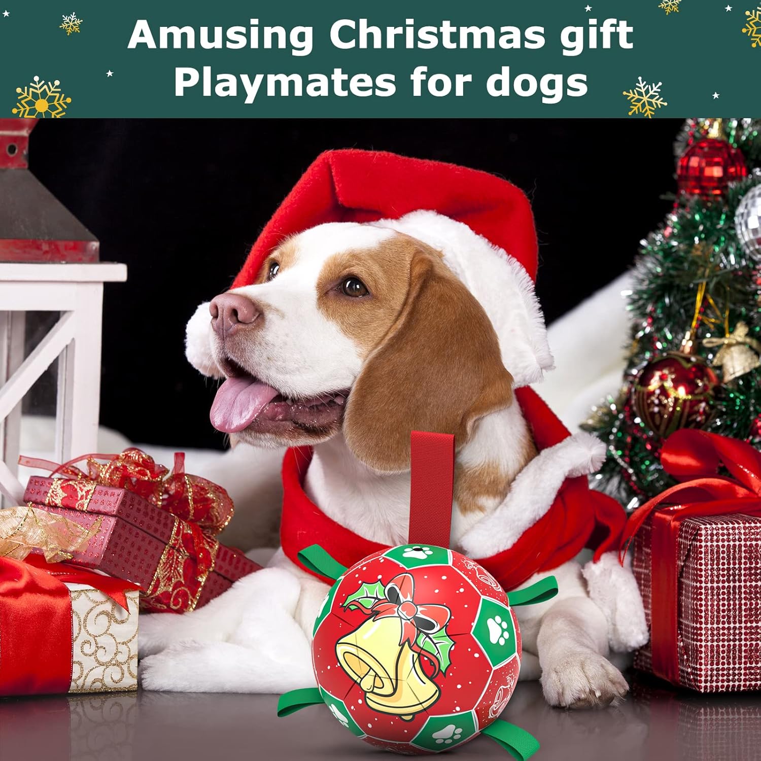 - AMUSING CHRISTMAS GIFT FOR DOGS: The dog Soccer Balls is made in rich colors of red, green and white with the theme of Santa, Christmas trees and presents. As one of our family members, dogs would have a great time with us if they received gifts like we do on Christmas Day. And which would be a precious gift for your dog to enjoy the warmth we bring him