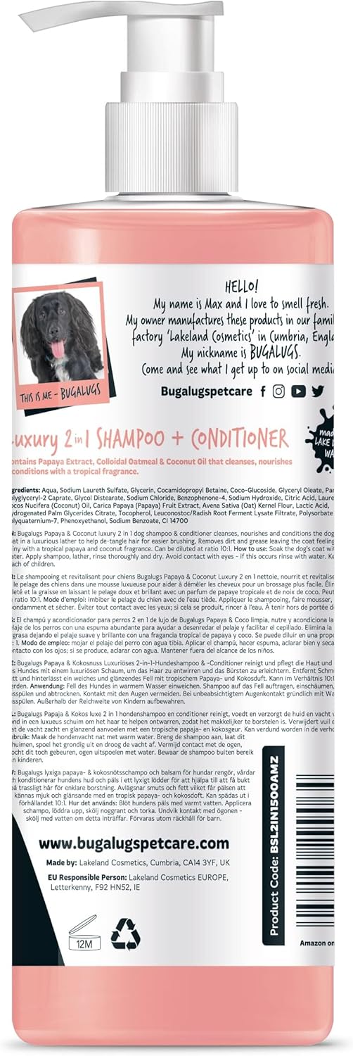 - 2 in 1 dog shampoo & conditioner– that cleanses, nourishes and conditions your dog’s coat with a tropical papaya & coconut fragrance.