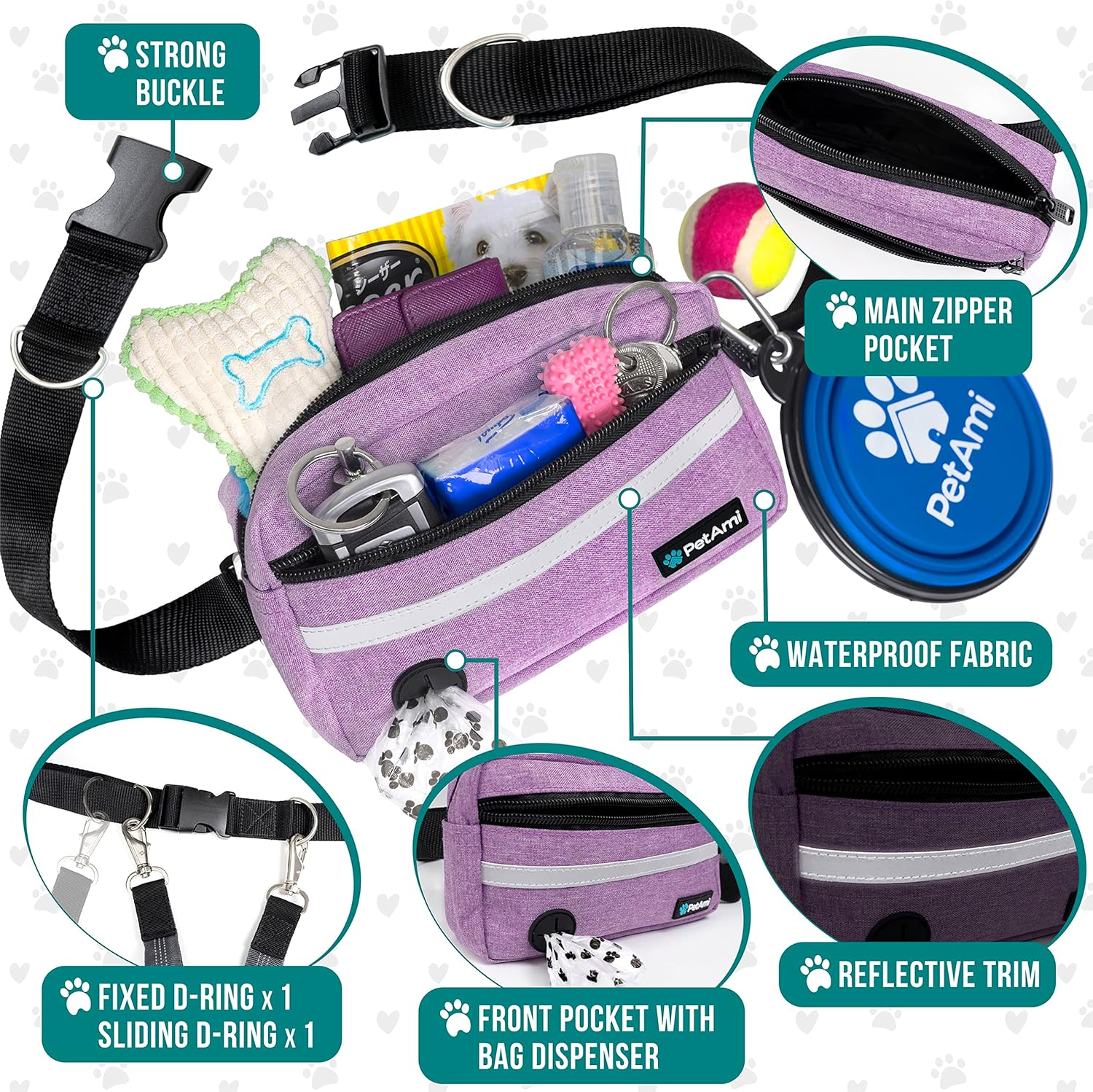 - ADJUSTABLE DOG TREAT TRAINING POUCH: Our wrap around dog hiking fanny pack strap is adjustable from 28 inch to 52 inch to provide a perfect fit for easy walking, backpacking activities with your pet. Featuring a double clip, one fixed and one movable attachment for attaching additional harnesses and waist leash allow for walking 2 dogs. Enjoy walks or runs with ease with PetAmi waist zipper pouch with dog belt leash for your dogs.