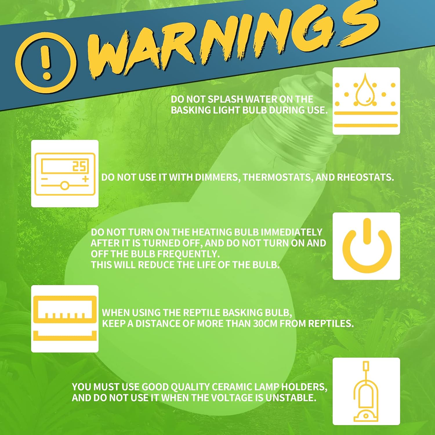 - 🦎Note - You must use good quality ceramic lamp holders, and do not use it when the voltage is unstable. Do not use it with dimmers, thermostats, and rheostats. Do not splash water on the basking light for reptiles during use. When using the reptile basking bulb, keep a distance of more than 30cm from reptiles. Do not turn on the reptile heat bulb immediately after turning it off, and do not turn the bulb on and off frequently.
