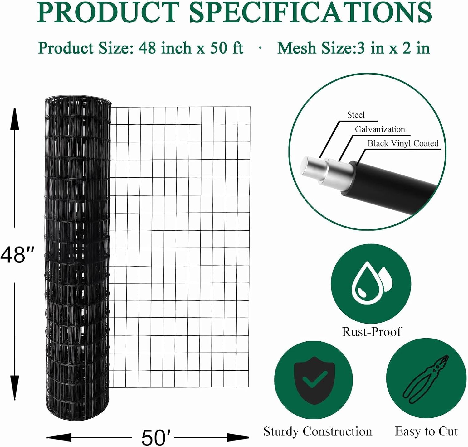 Black PVC Coated Welded Wire Fence 48 Inch x 50 Foot, 2 Inch x 3 Inch 16GA, Garden Border Fencing Roll Vinyl Coating Metal Wire Mesh for Yard Vegetable Plant Protection Poultry Netting