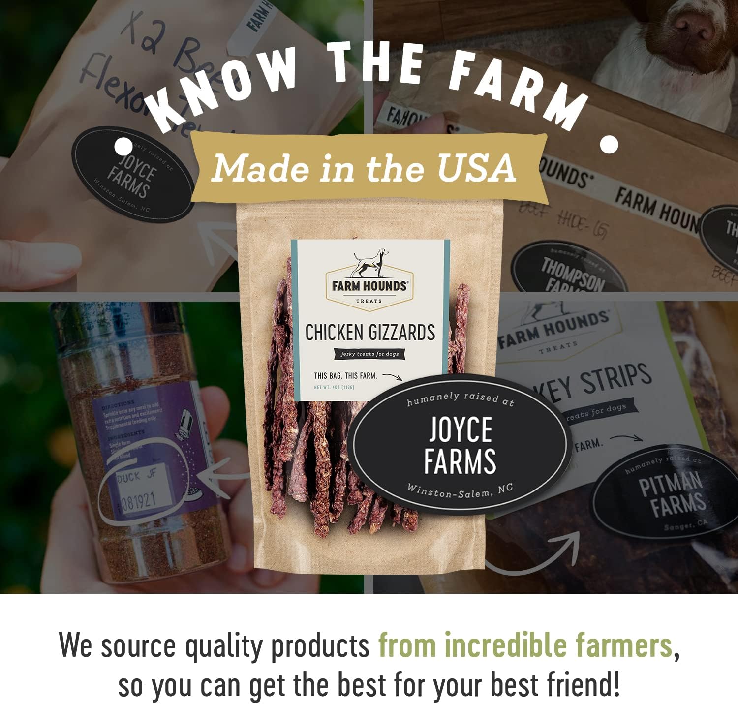 - FARM HOUNDS - At Farm Hounds, we believe healthier animals are happier animals. With your canine in mind, we make all of our treats nutritionally beneficial and delicious. Our close relationship with all-American family farmers who raise their animals in a humane way, helps us use premium raw materials for our products.