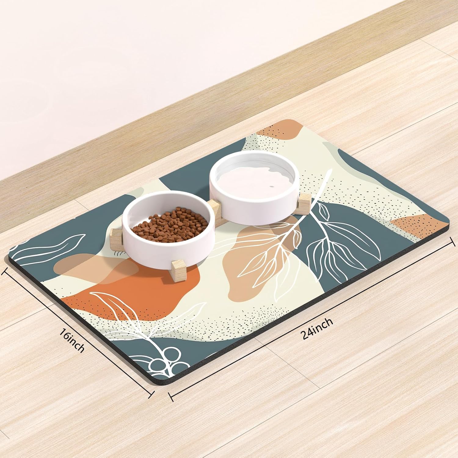 Rnivvi Dog Food Mat, 16" x 24" Boho Absorbent Dog Cat Bowl Mat for Food and Water, Cute Anti-Slip Rubber Pet Feeding Rug Protect Floors, Puppy Placemat for Feeding & Watering Supplies, Abstract Leaves