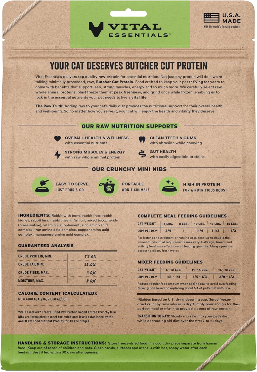 - CRUNCHY FREEZE-DRIED RAW RABBIT CAT FOOD: Vital Essentials Crunchy Freeze Dried Cat Food packs more protein than industry standard into every bite to deliver the peak vitality your cat deserves, especially when compared to dehydrated cat food. This complete and balanced freeze-dried raw cat food is made with premium butcher cut rabbit, responsibly sourced in the EU.
