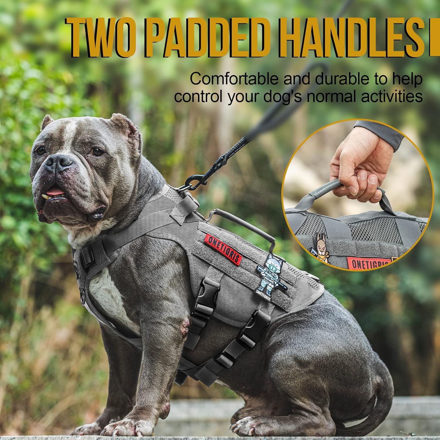 - [Molle/Handles]: Looped MOLLE panel on both sides for MOLLE compatible add-ons such as treat totes, poop bag pouches, service dog kits, military patches and name tags. 2 padded grab handles with reinforced stitchin. Useful for getting in/out of a car, immediate canine control in crowded areas or with other dogs, etc.