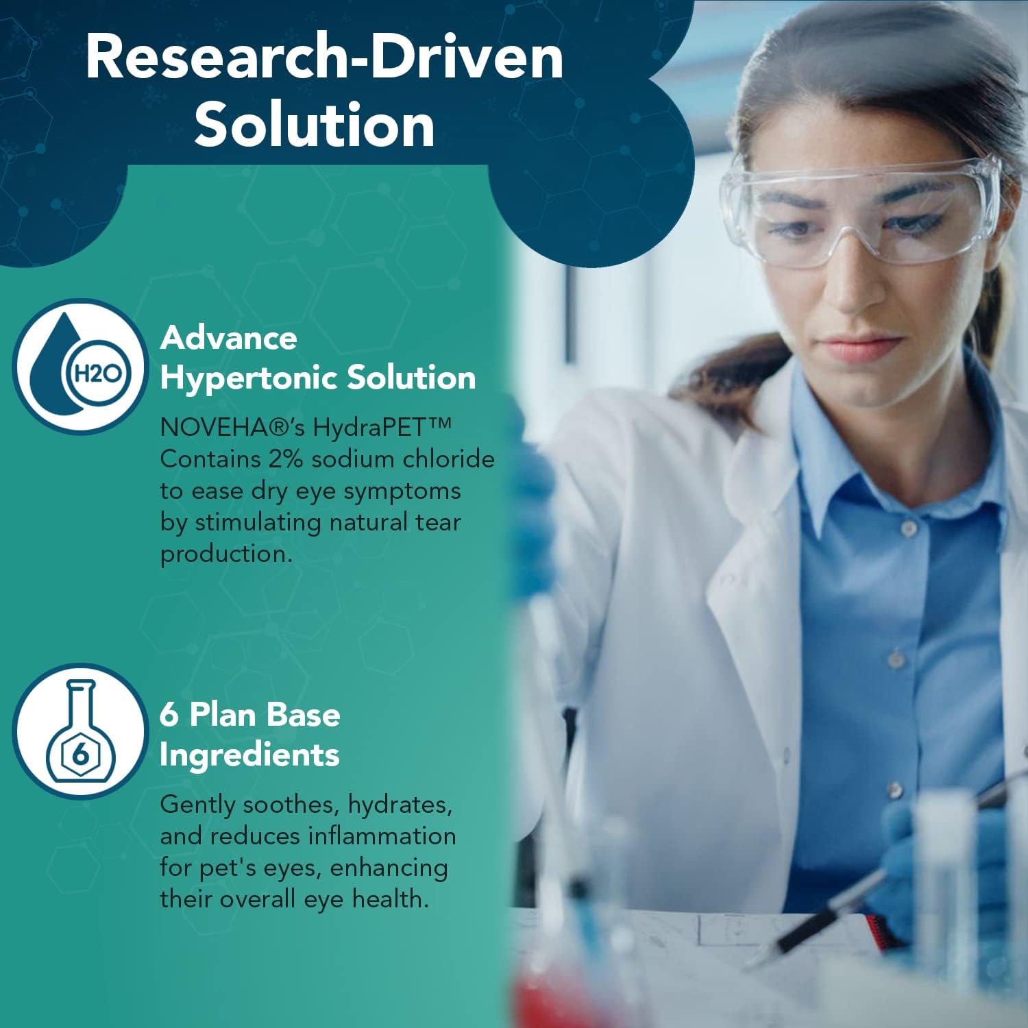 - THE ULTIMATE EYE DROPS FOR YOUR PET’S EYES: NOVEHA’s HydraPET eye drops contain 2% sodium chloride which has a higher concentration of salt than the natural tears in the eye. Acting like a sponge, this can help draw out excess fluid from the cornea and reduce corneal edema. Additionally, the use of these eye lubricating drops can help improve tear film stability and reduces dry eye by promoting the production of natural tears. Your pet deserves to see well and feel well