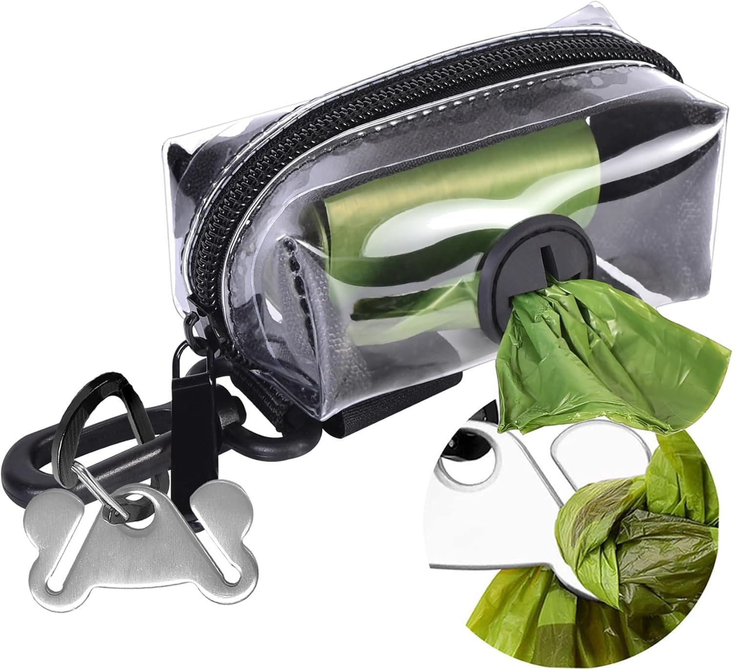 Clear Metal Dog Waste Bag Dispenser & Holder - Portable, 1 Hand Free, Fits Leash Accessory, Set Includes Dog Poop Bags