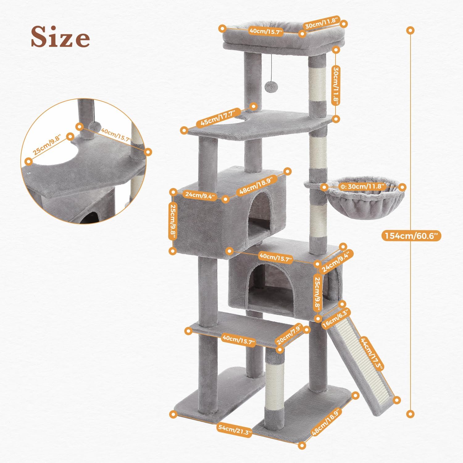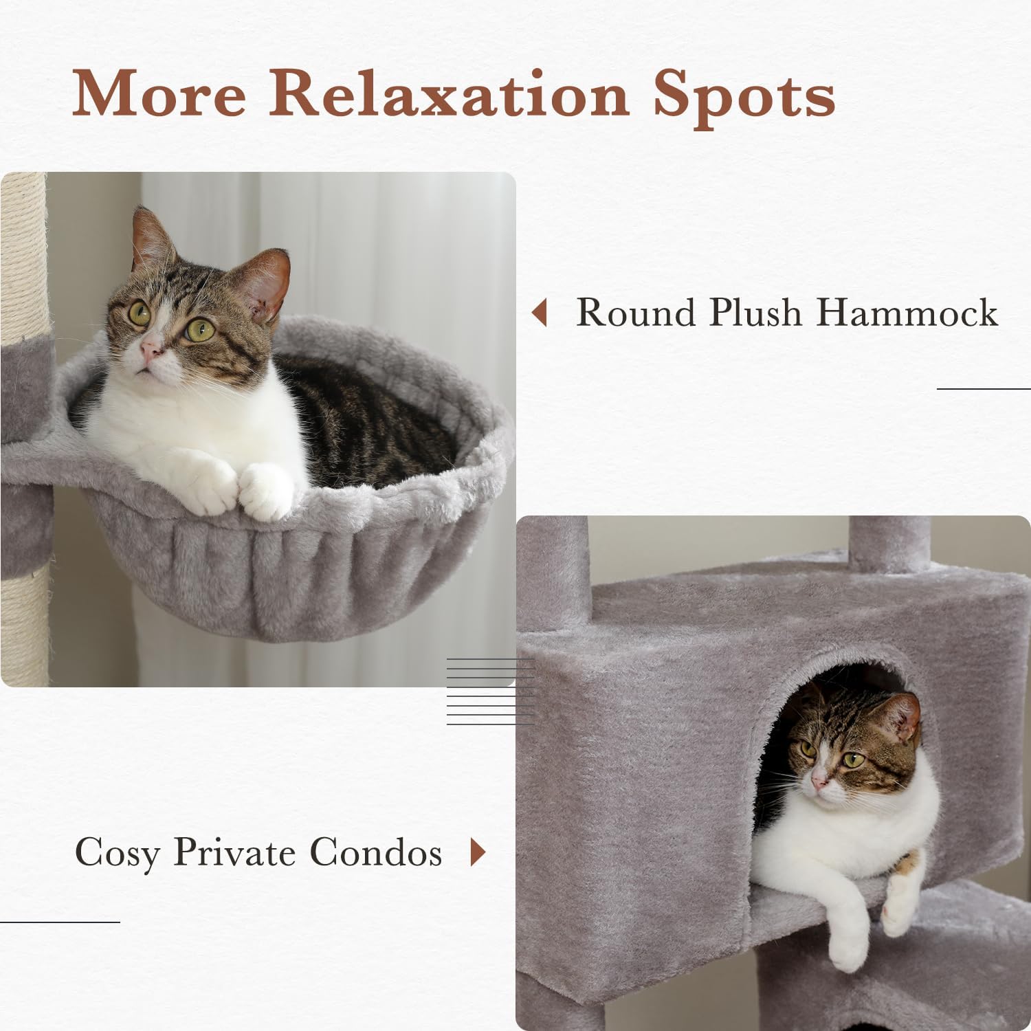 PAWZ Road Cat Tree, 60 Inches Cat Tower with Dual Condos, Spacious Perch, Cozy Basket and Sisal-Covered Scratching Posts for Indoor Cats- Gray