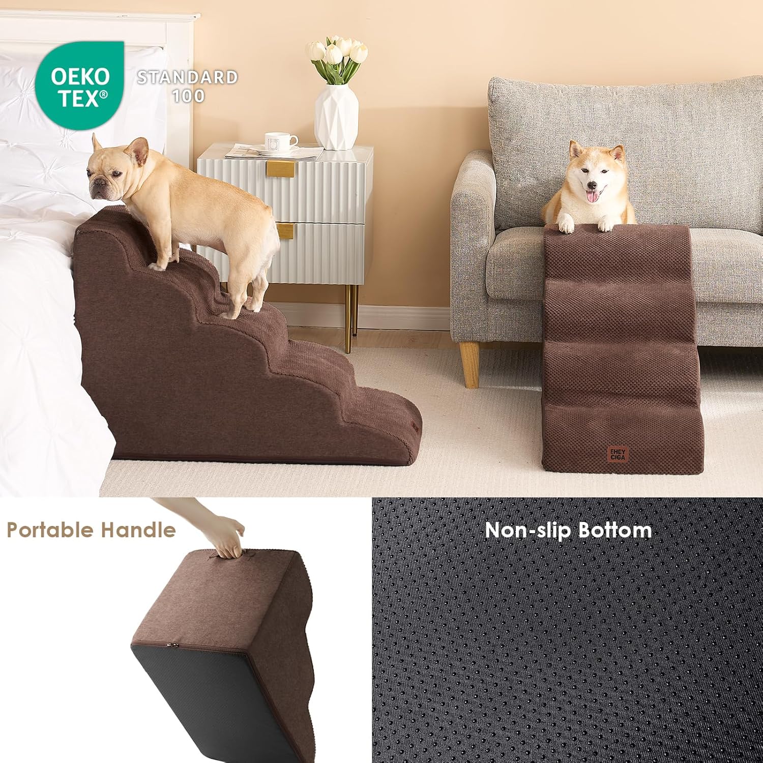 - SPECIFIC AND STEADY DESIGN - 33D density of pure foam make this stair more steady when your pets walk on. The dog bed stairs can provide strong support for pets in the walking process. Low angle slope design can better protect your pet's joints.
