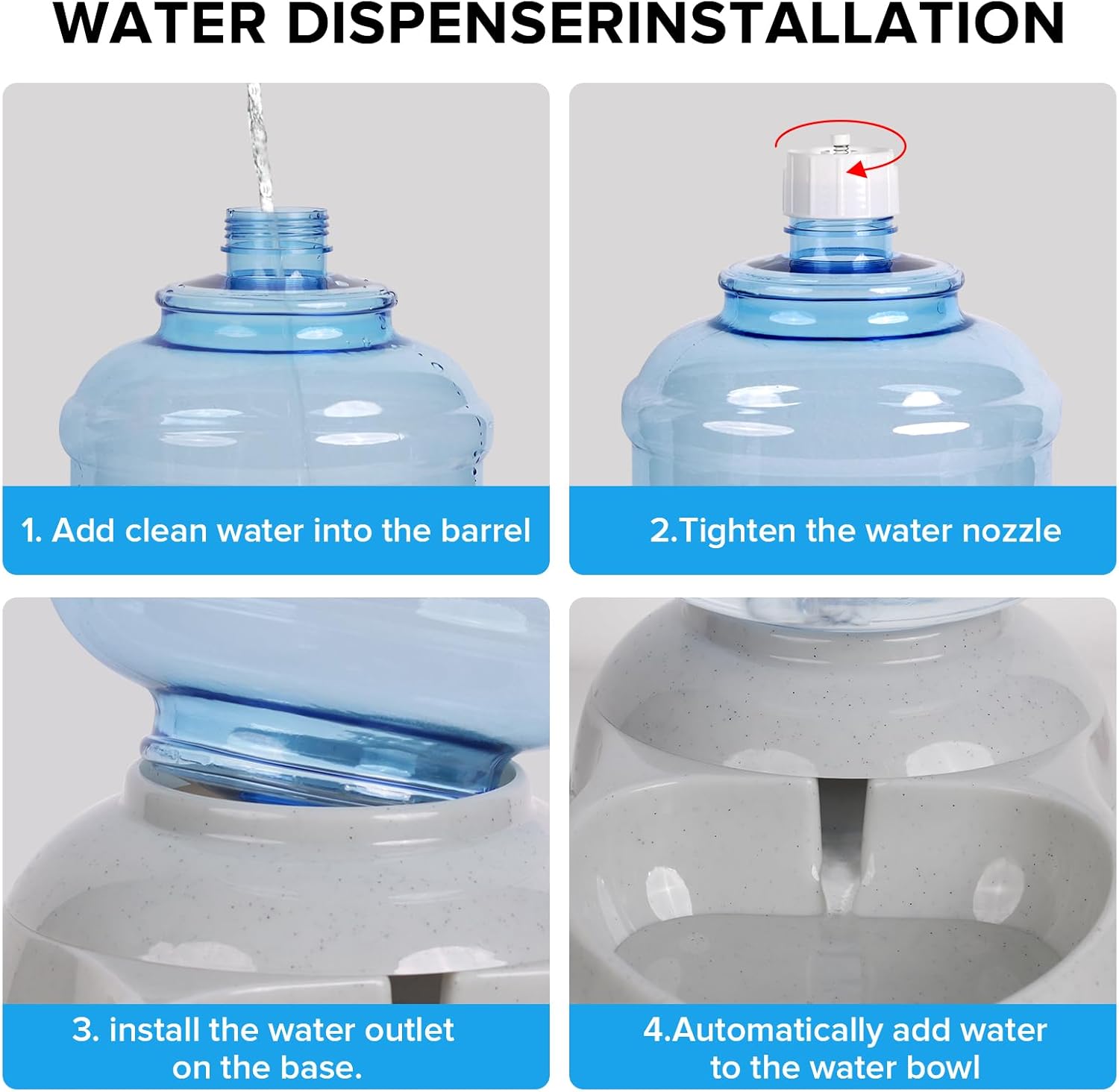 - Dog Water Dispenser Easy To Use:To use this automatic pet waterer, you simply fill the bucket with water and snap it onto the base. The water will automatically refill the bowl. The base has four non-slip pads so you can place the water dispenser anywhere without worrying about your pet moving it around