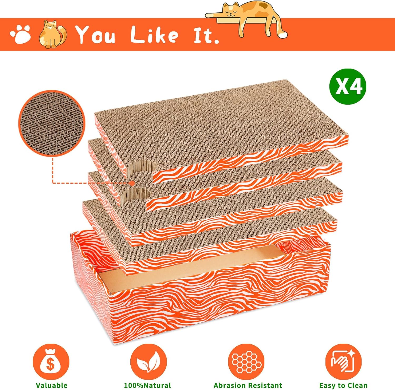 - š»ćValueablećļ¼Refillable, Reverable Usage and Long Lasting, kitty scratcher box including 4 pcs high density carboard , two sides of each board can be scratched, it means long lasting for monthes due to 8 sides totally can be scratched.