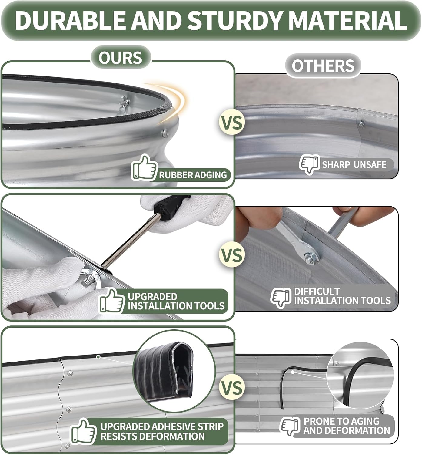 - 【Double Safety Edge Design】 The top edge of the garden bed is folded to prevent sharp edges, and we also provide rubber strips for added protection. The galvanized planting box is the perfect start for your favorite vegetable garden.1More raised bed is your best choice for worry-free gardening.
