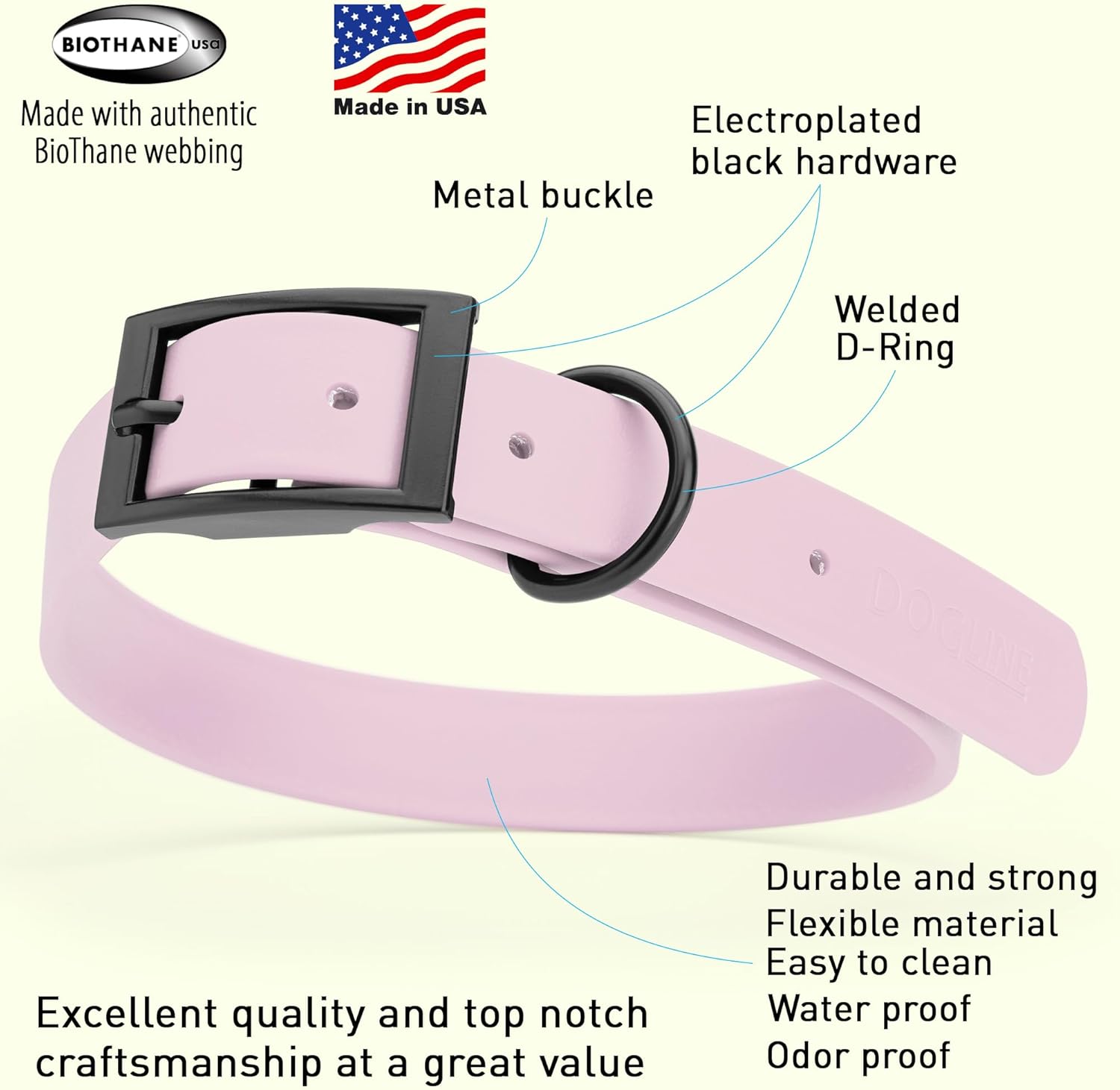 • Free Your Dog to romp in puddles and retrieve from lakes with the Dogline Biothane Waterproof Dog Collar. This water-repellent collar stays dry and odor-free, without shrinking or losing flexibility.