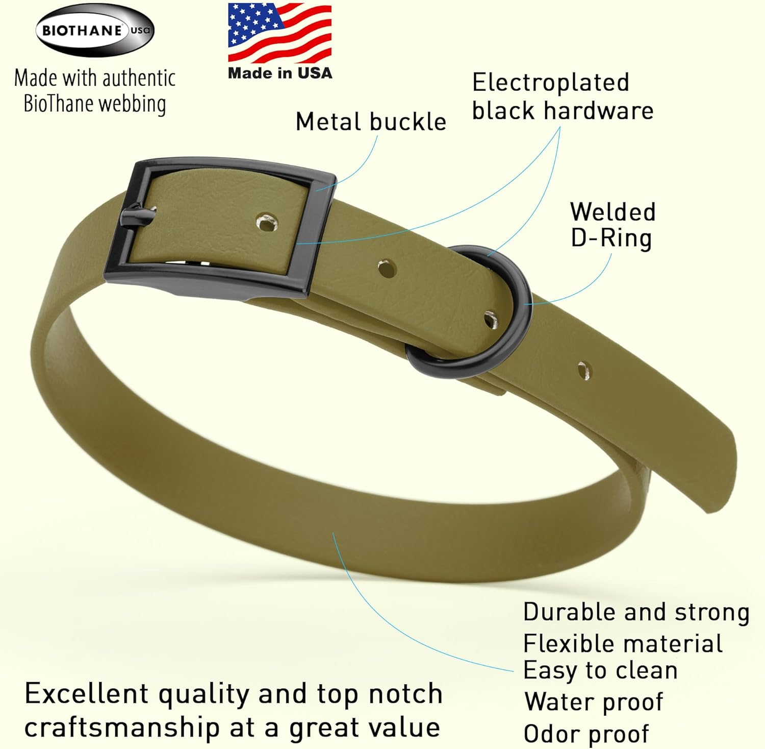 Dogline Biothane Waterproof Dog Collar Strong Coated Nylon Webbing with Black Hardware Odor- Proof for Easy Care Easy to Clean High Performance Fits Small Medium or Large Dogs, Olive Drab Green