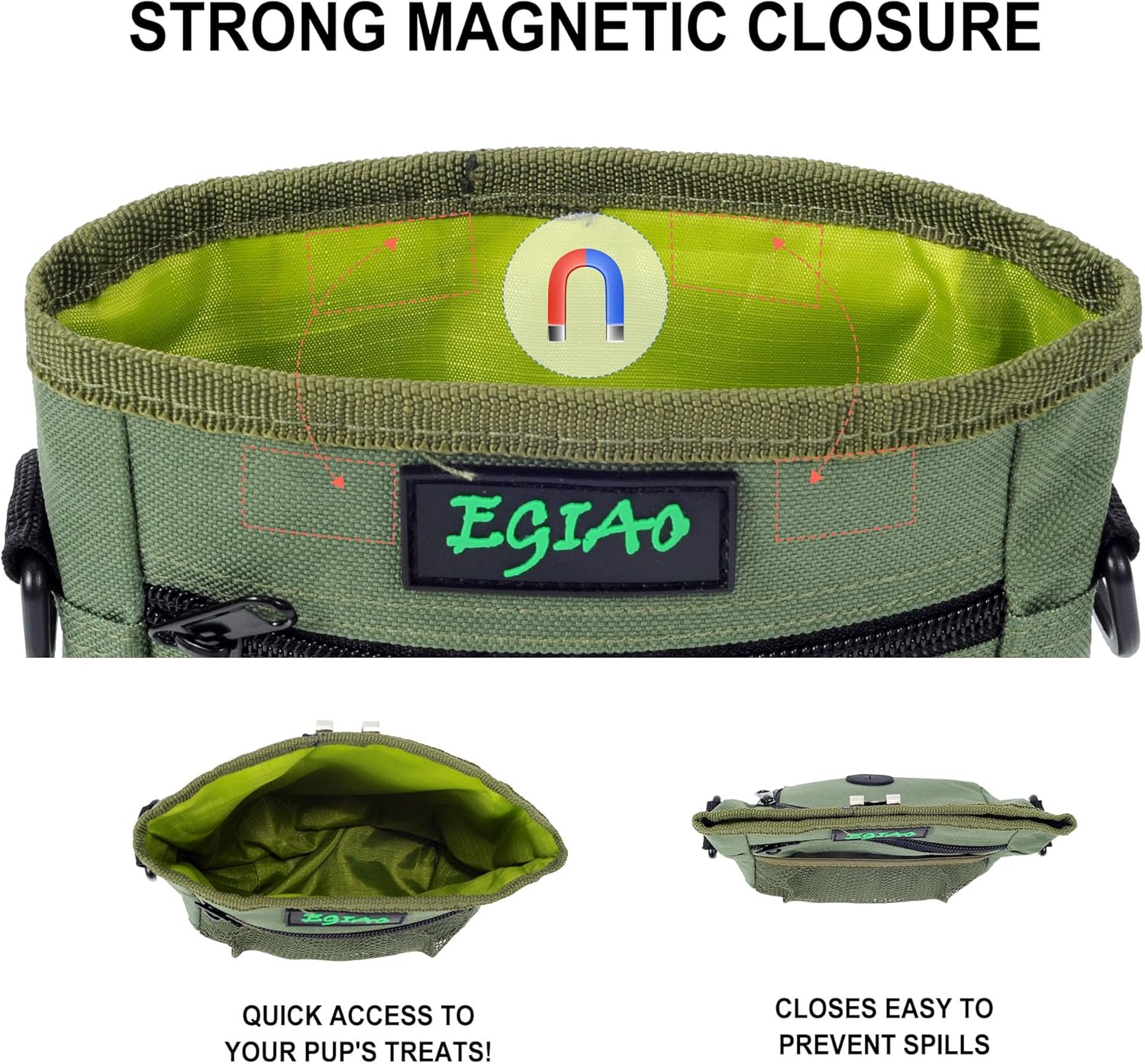- 🐾Unique and Reasonable Design: Our dog treat pouch has a convenient magnetic closure design, which can be easily opened and closed by one-handed operation. When closed, the items in the dog food bag will not fall regardless of bending, running, etc. And dog treat bag fits your waist perfectly, helping you to reduce fatigue when interacting with the dog for a long time, and can meet all your training needs.