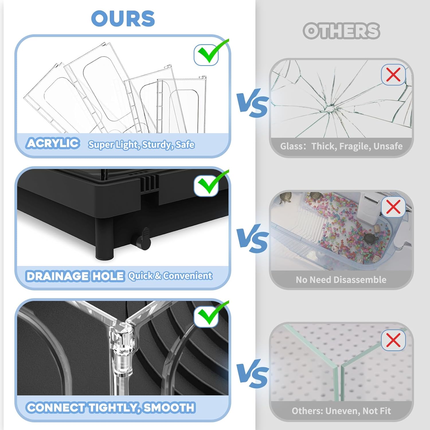 - ăTRANSPARENT DESIGN FOR BETTER VIEWINGăTurtle habitat is built with acrylic panels. Acrylic panels are completely transparent. You can enjoy the inside view clearly and watch your pets easily. The panel has a thickness of only 5mm which is much lighter, safer and more durable if compared with those made of glass.