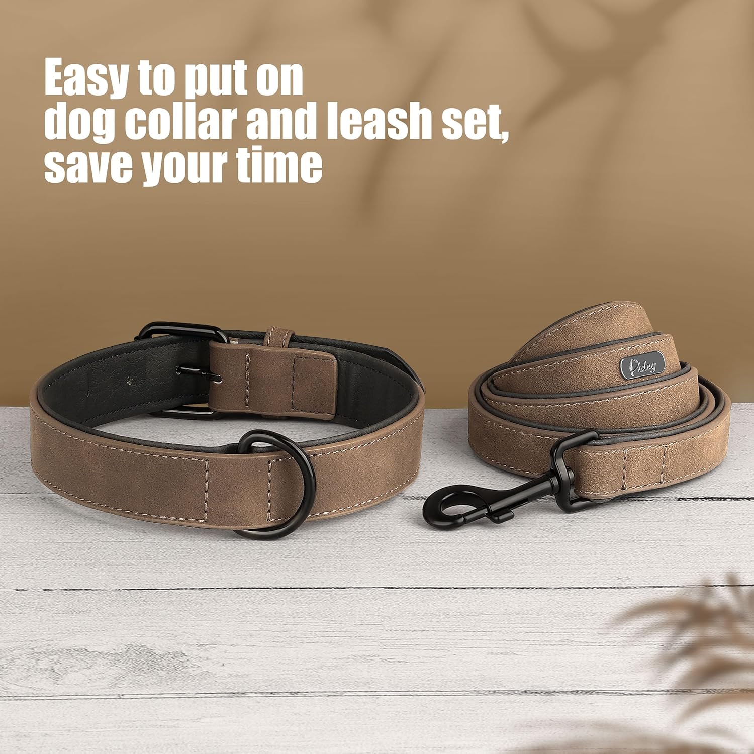 Didog Soft Padded Leather Dog Collar and Leash Set, Adjustable Dog Leash and Collar Set with Metal Buckle, Breathable Dog Collars with 4FT Leather Dog Leash for Small Medium Large Dogs, Brown, L