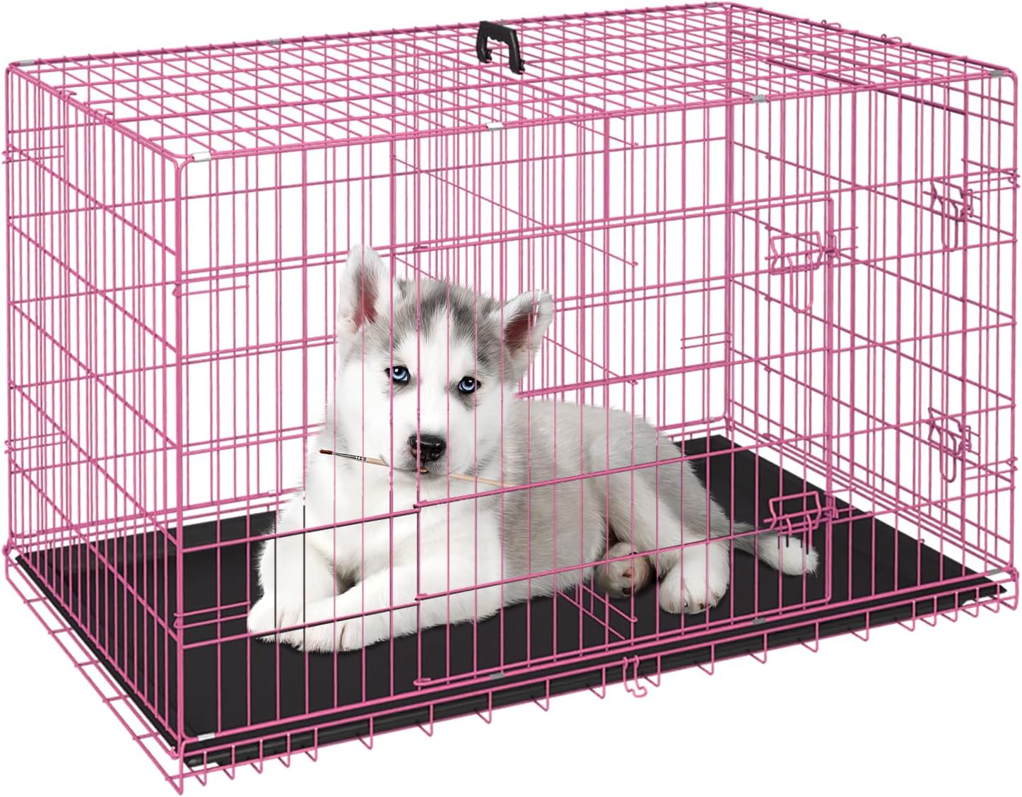 FDW Dog Crate for Small Dogs 24 Inch Folding Metal WirePet Cage Double Door W/Divider Panel Indoor Outdoor Kennel Leak-Proof Plastic Tray,Pink