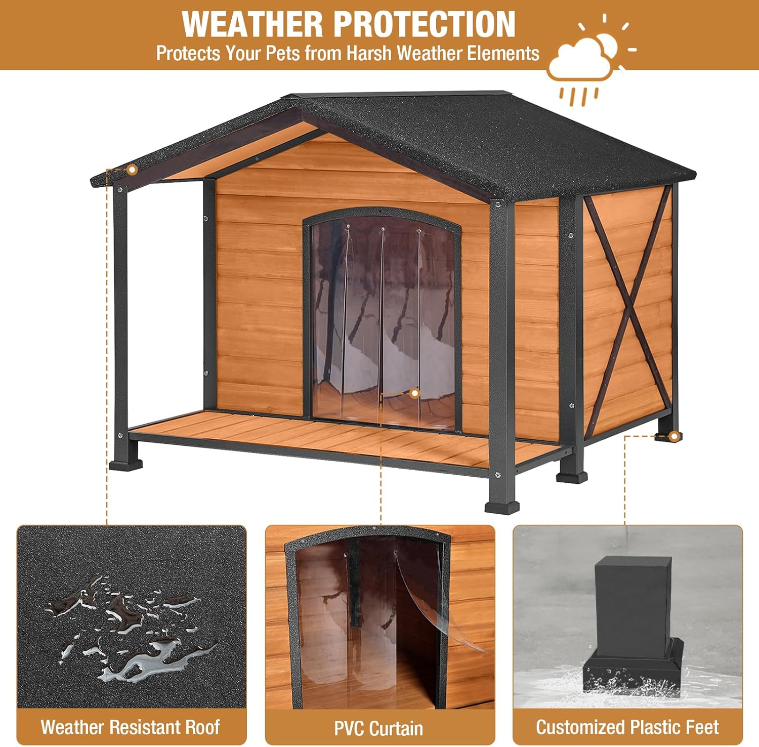 - 【Weather & Water Resistant】Cabin Dog house with security waterproof paint, raised floor with customized plastic waterproof feet pad & asphalt roof & high quality curtain provide protection from the elements and keep the cabin comfortable & dry.