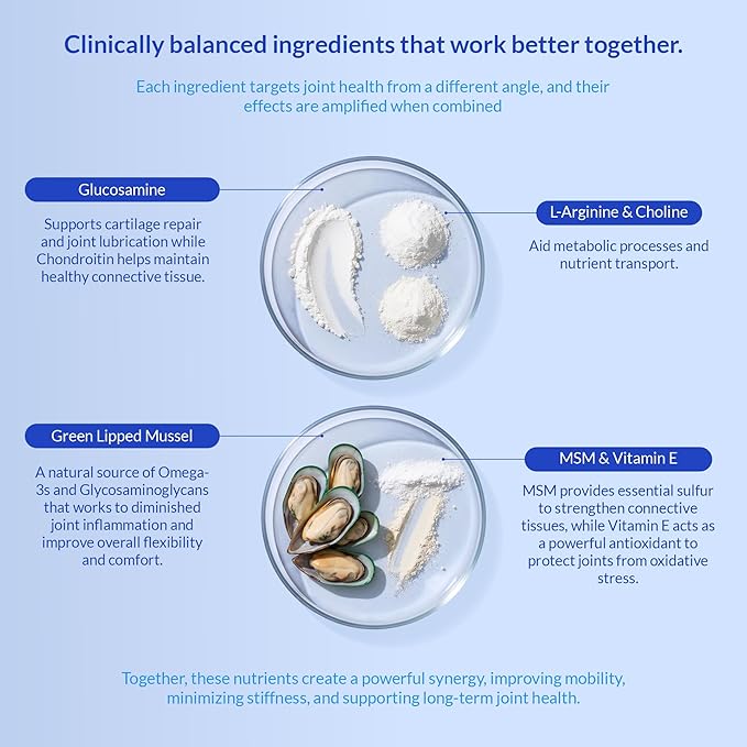 - Promotes joint lubrication Supports the health of synovial fluid, which is vital for smooth, frictionless joint movement, ensuring greater comfort.