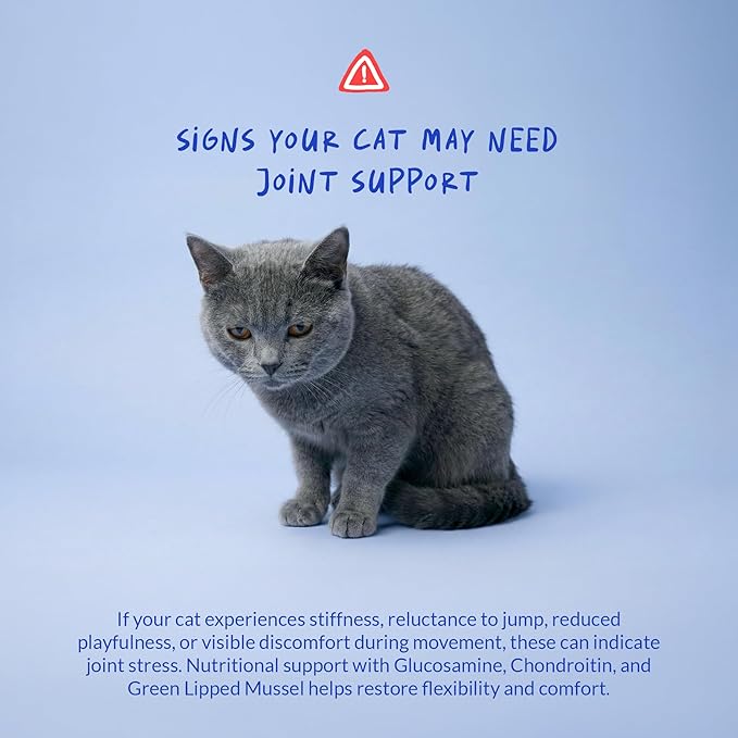 - Eases joint stiffness Aids in alleviating occasional joint stiffness and soreness, especially beneficial for older cats or those with active lifestyles.