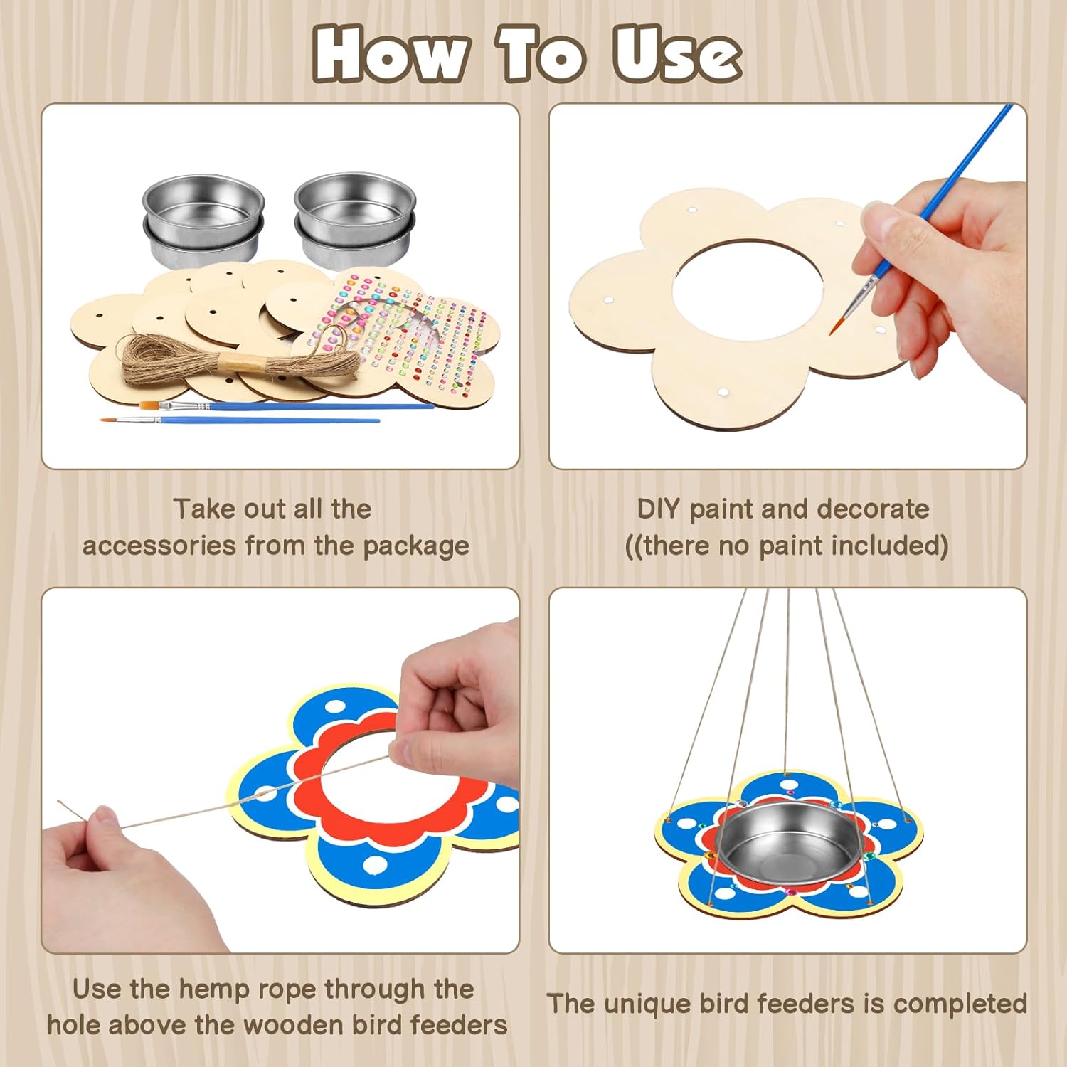 - Wooden Bird Feeders Kit: The bird feeders for Kids package includes 4 xunfinished wooden bird feeders, 4 xstainless steel bowls, 2 xpainting brushes( There no paint included), 1x10m hemp rope 1x rhinestone stickers 1x instruction. Fully equipped, kids can play freely and create their own artwork!Fun and creative crafts keep them busy and enjoy the handcraft entertained.let their creativity run wild!