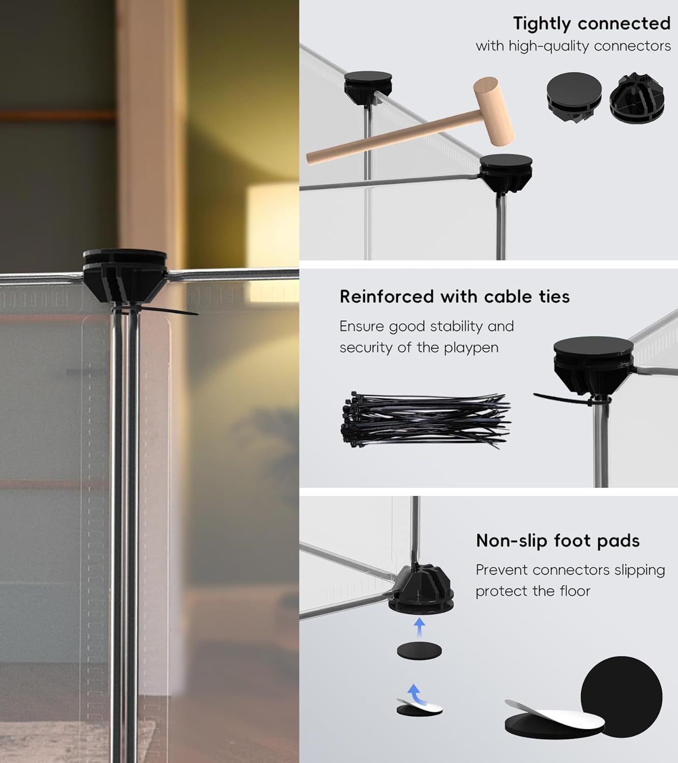 - ๐๐๐ฌ๐ฒ ๐๐ฌ๐ฌ๐๐ฆ๐๐ฅ๐ฒ ๐๐ง๐ ๐๐ฑ๐ฉ๐๐ง๐ฌ๐ข๐จ๐ง:Simply use the included hammer to connect the panels with multi-angle connectors, enabling you to DIY various shapes and easily assemble penels to change into the shapes and heights you desire.